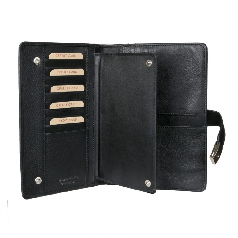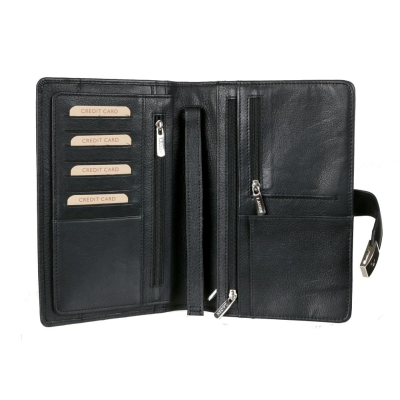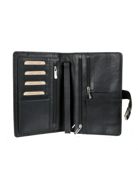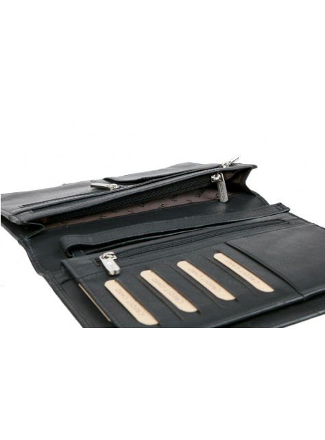 Pravá koža, vysokej kvality, precízne vypracovanie. Puzdro má vystužené steny, obsahuje rôzne vnútorné priečinky otvorené aj zipsové. Zapínanie na elegantnú kovovú pracku.