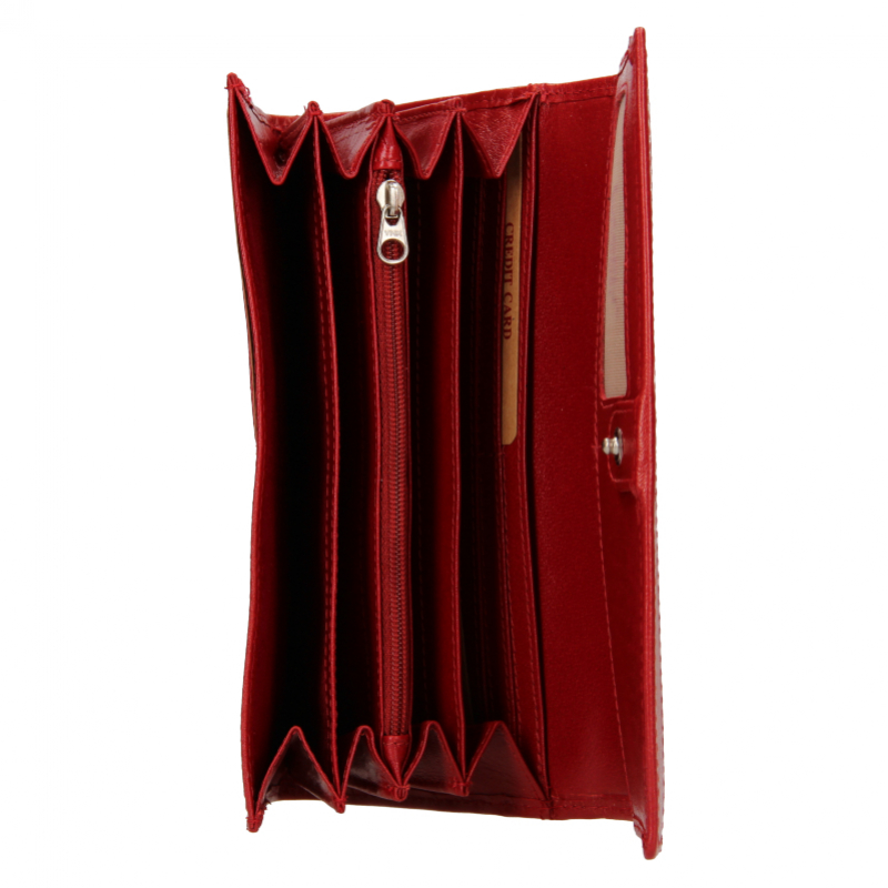Kožená peňaženka s priestrannými priečinkami a širokým vejárovitým otváraním. Koža červená malinová, hladký povrch s prirodzeným vrásnením. Vysoko elegantné, masívne avšak odľahčené prevedenie. Uzatváranie kovovým patentom. Vyhovuje aj staršiemu typu osobných dokladov.