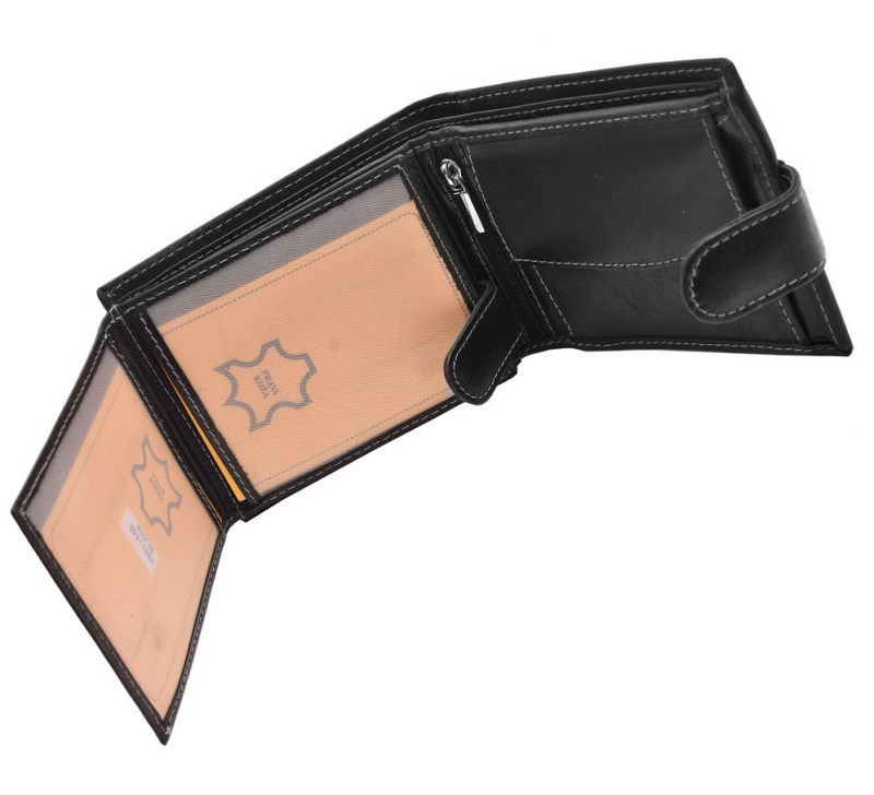 Peňaženka so zapínaním s vonkajšou aj vnútornou prackou istiacou doklady a karty proti vypadnutiu.