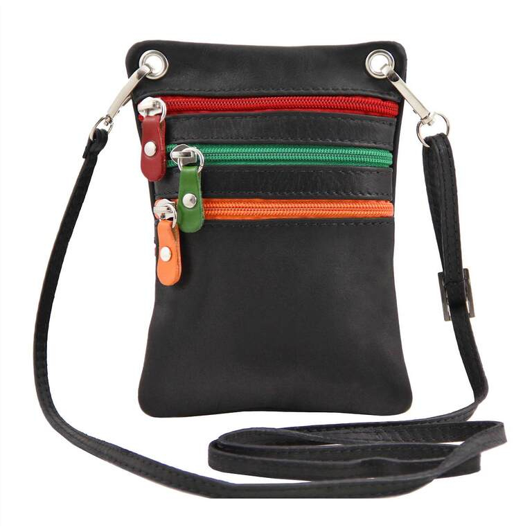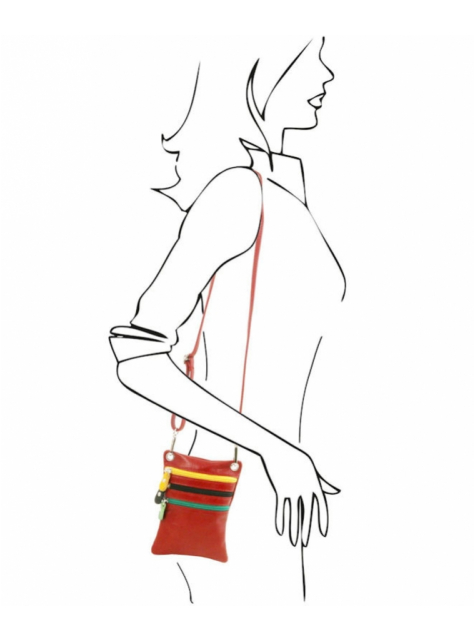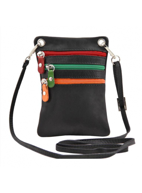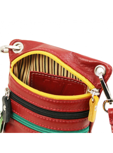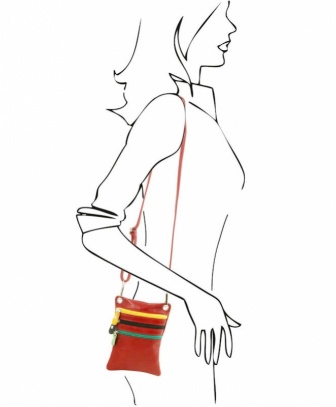Kožená mini taška crossbody značky TUSCANY LEATHER. Nosenie na rameno alebo cez plece odnímateľným a nastaviteľným popruhom (regulácia dĺžky do 120 cm, š.1 cm). Uzatváranie priečinkov na zips. Predný priečinok (vhodný na mobil) a zadný po celej ploche taštičky, každý s vnútornou stenou z brúsenej kože.