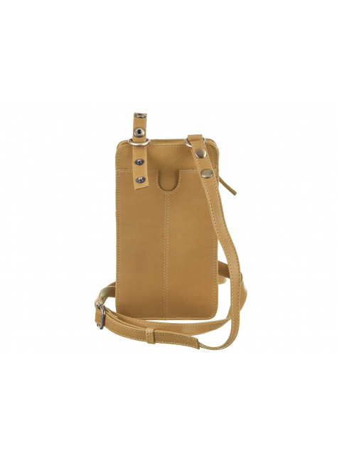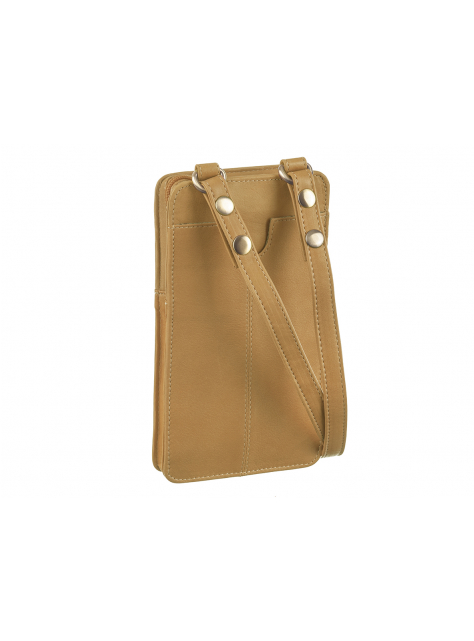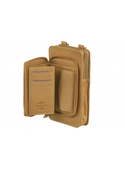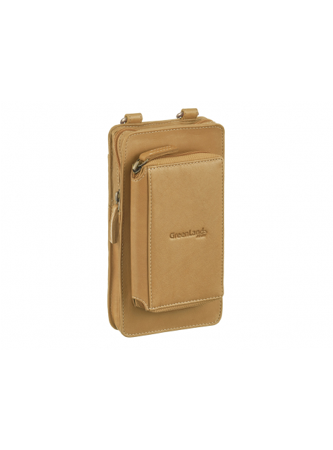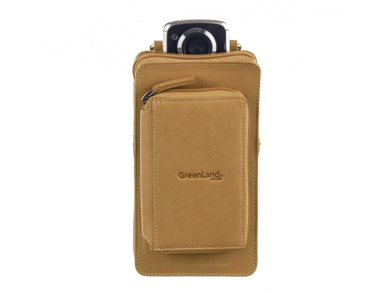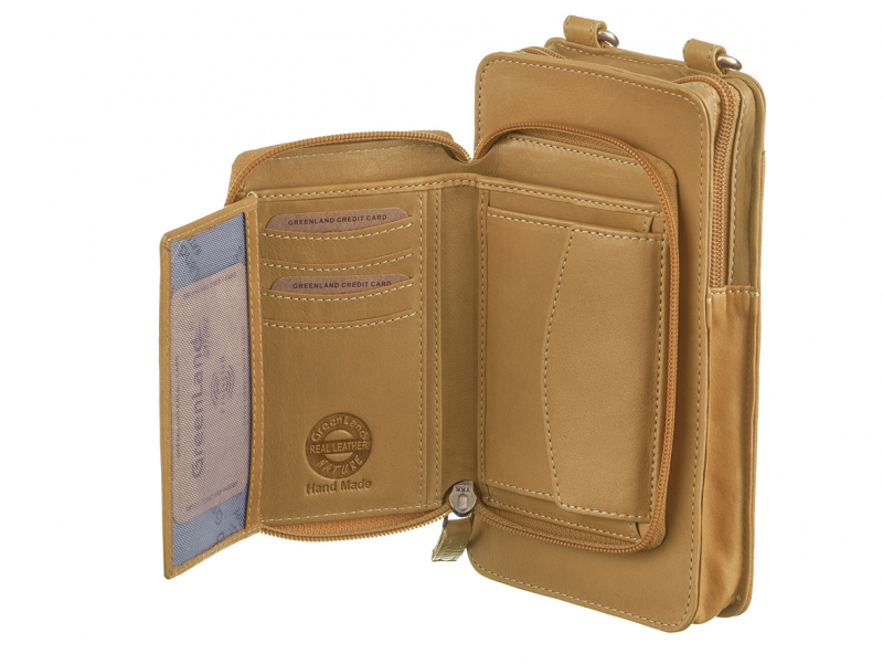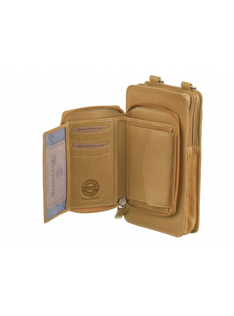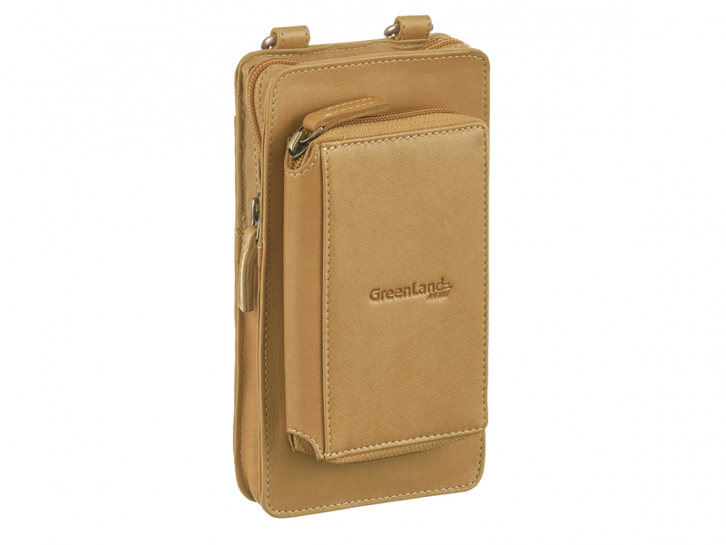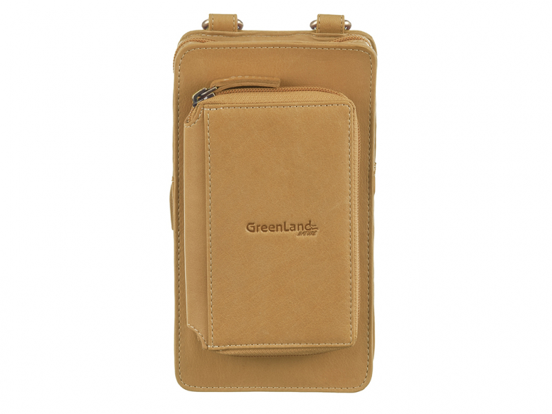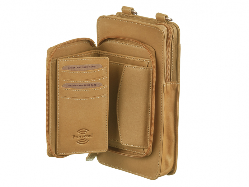 Kožená príručná taštička nemeckej značky GREENLAND - výška 20 cm x šírka 11 cm x hĺbka 3 cm - s peňaženkou na prednej stene a puzdrom na smartfón na vonkajšej zadnej stene -produkt je vybavený RFID ochranou, čo znamená, že celý obsah peňaženky je chránený proti krádeži údajov z bankových kariet.