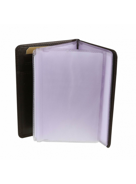 Dokladovka a puzdro na karty a vizitky z hladkej kože v čiernej farbe. Pevná úprava s okrajovým prešívaním. Obsahuje vyberateľné PVC listy. Vyhovujúca aj staršiemu - väčšiemu typu osobných dokladov (vrátane vodičského preukazu).