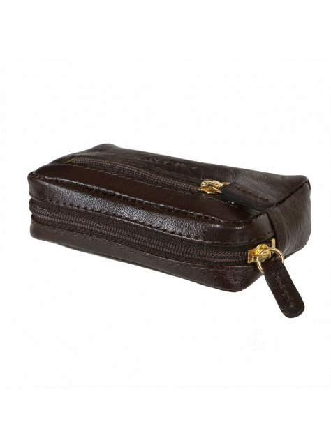 Kožené puzdro na kľúče. Vnútro s 2 kovovými retiazkami ukončenými kovovými prstencami pre uchytenie kľúčov. Vonkajšia strana s malým odkladacím priečinkom na zips.