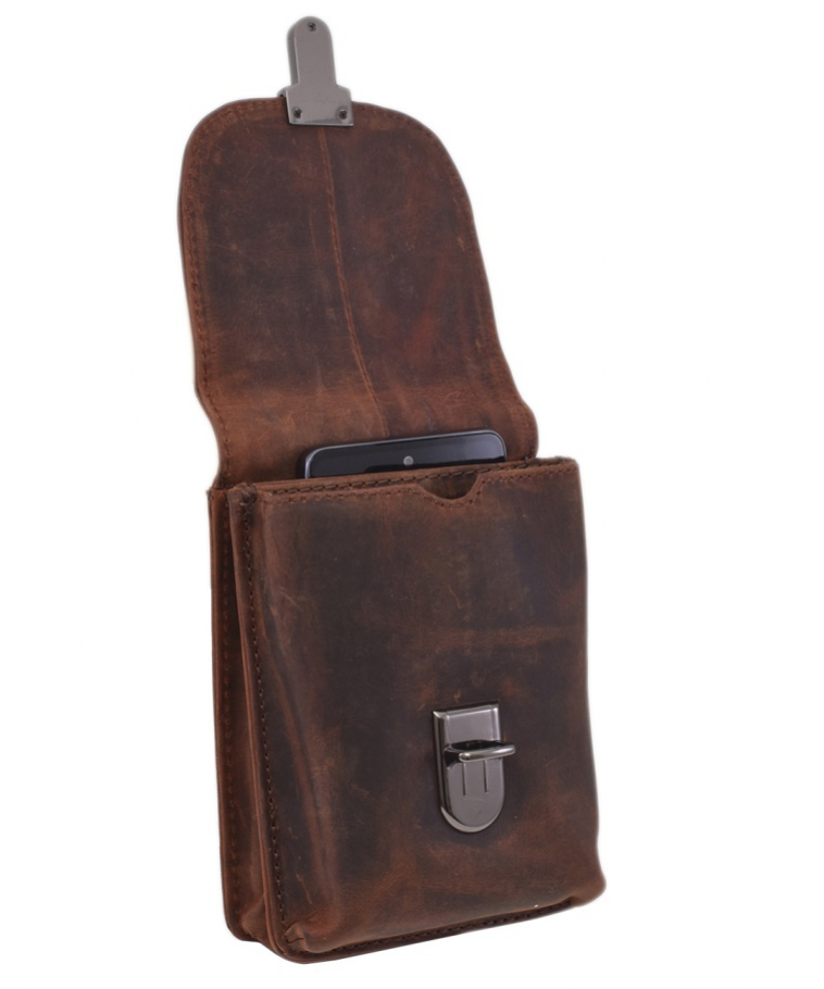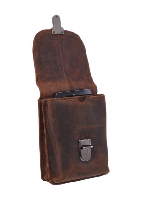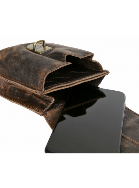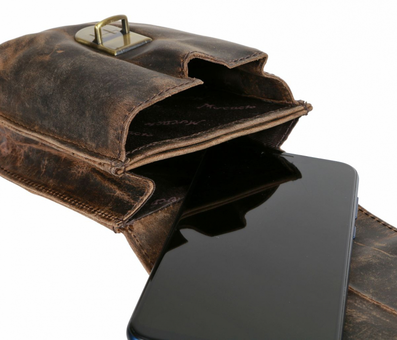 Štýlové kožené puzdro na opasok zn. MERCUCIO so zapínaním na kovovú pracku a razeným motívom motocykla. Vyrobené z kvalitnej pevnej kože v mramorovanej úprave. Puzdro je vhodné na bežné osobné veci - kľúče, mobil (max. výška 16,5 cm), peňaženka a pod. Kožené pútko na zadnej strane vyhovuje pre opasok šírky do 5,5 - 6 cm.