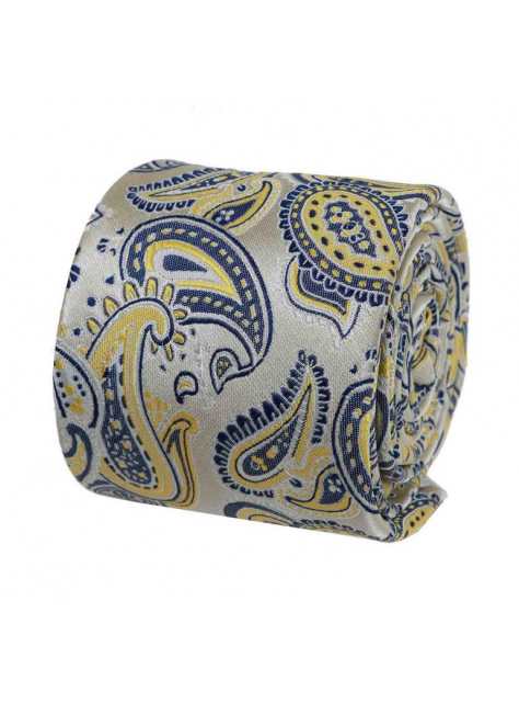 Pánska elegantná kravata z kolekcie ORSI TIES. Béžovo-smotanová so žltým a modrým vzorom.
