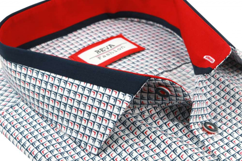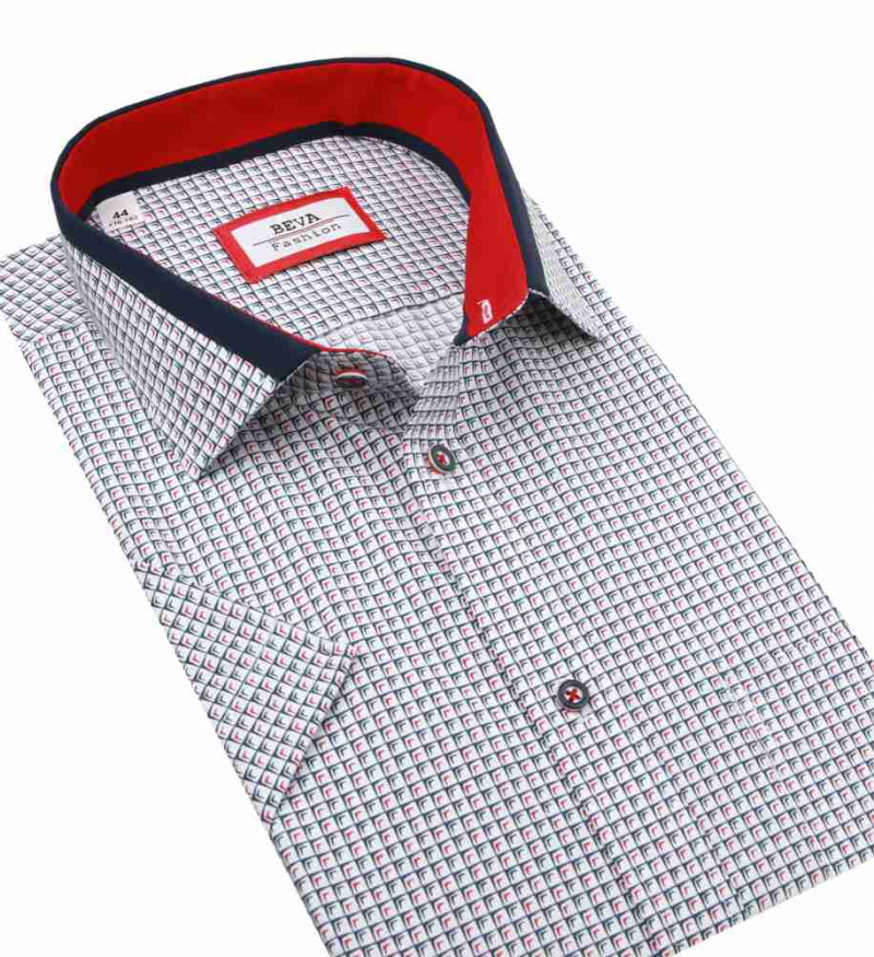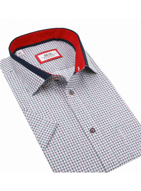 Ležérna a nadčasová pánska košeľa BEVA FASHION. Biela košeľa s modrým a červeným vzorom v klasickom strihu, krátky rukáv. Košeľa na výšku postavy 176 - 182 cm.