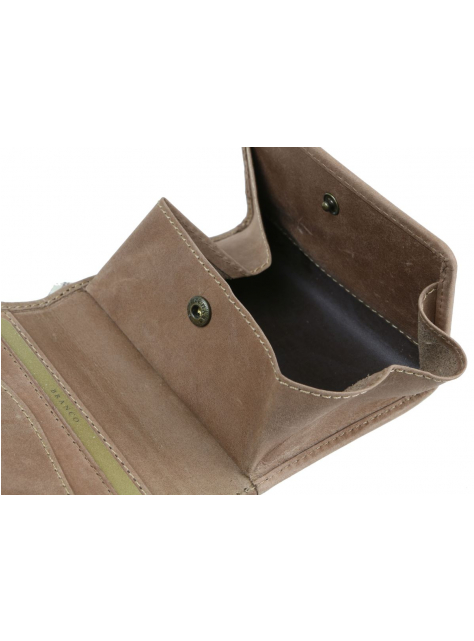 Malá kožená peňaženka s francúzskym mincovníkom a širokým oddelením na bankovky Uzatváranie patentom (2 polohy zapínania), široko otvárateľný francúzsky mincovník - vnútro celokožené, 3 priehradky na karty, 1 priečinok na akýkoľvek formát bankoviek (v 9,5 x š 16 - 23 cm), zvyšné oddelenie v časti na bankovky je súčasne aj skrytým priečinkom na karty.