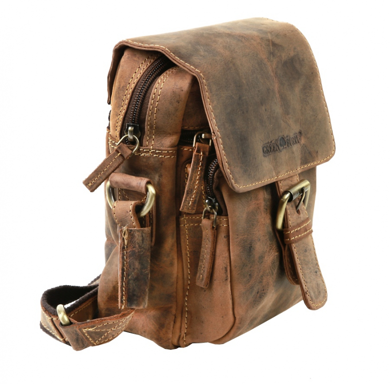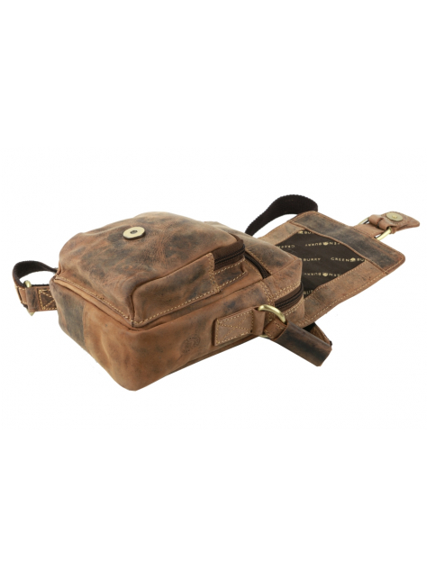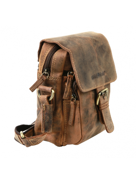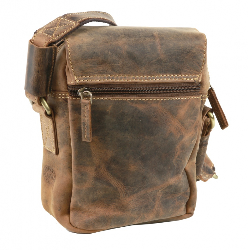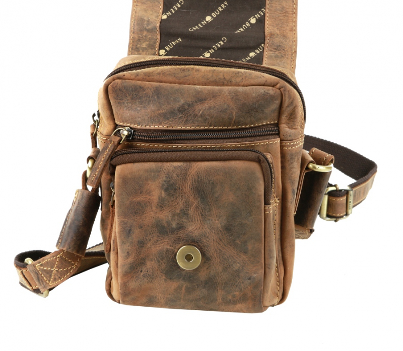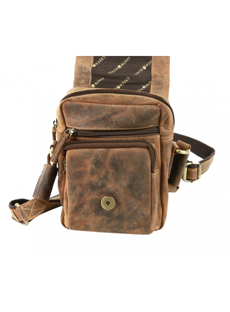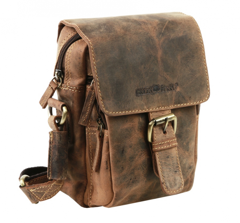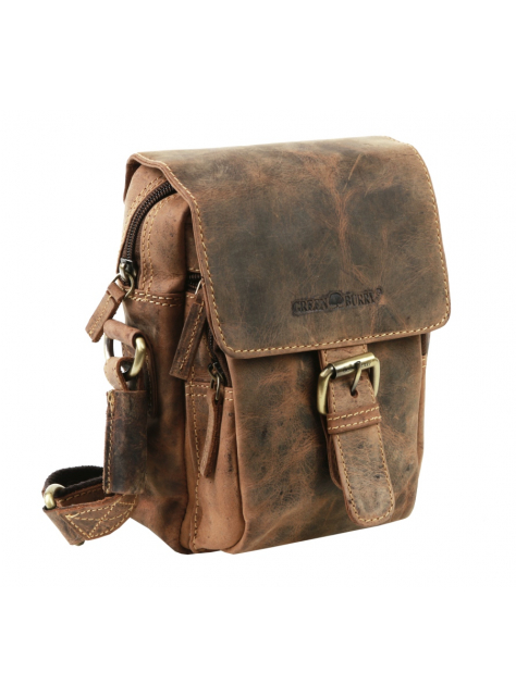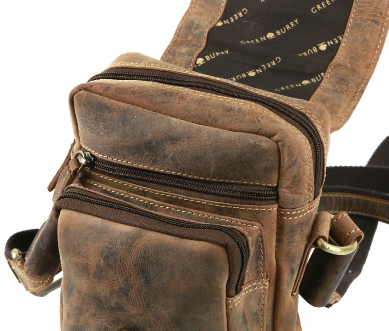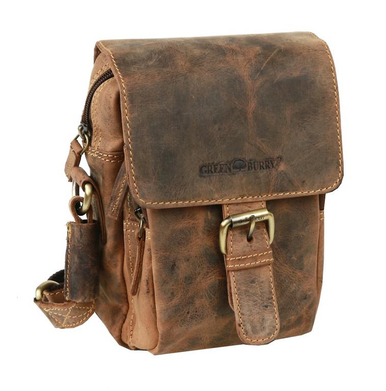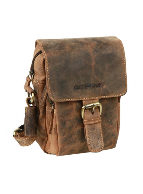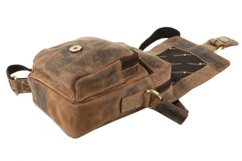 Športovo-elegantná príručná taška GREENBURRY na rameno alebo cez plece. Vintage taška z brúsenej kože. Formát na výšku s uzatváraním na kovovú pracku (pod koženým ozdobným strmeňom).