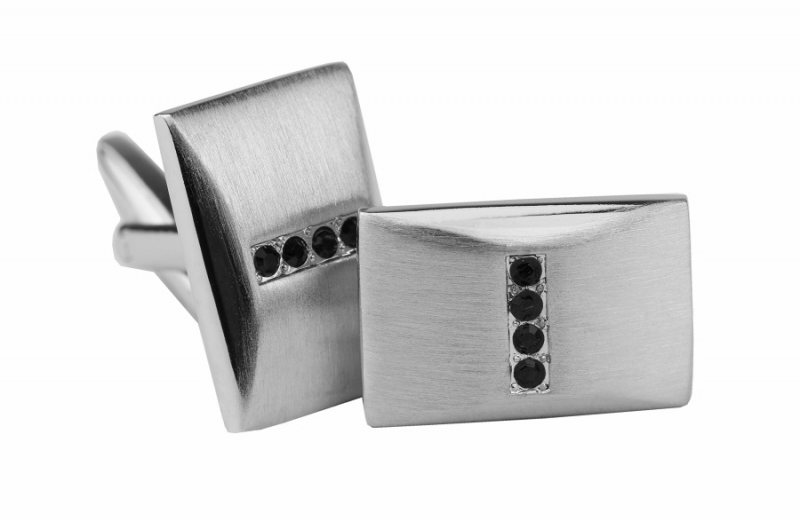 Elegantné manžetové gombíky zmatnenej úpravy v strede jemne zaoblené so vsadenými čiernymi kryštálikmi, okrajové hrany lesklé.
