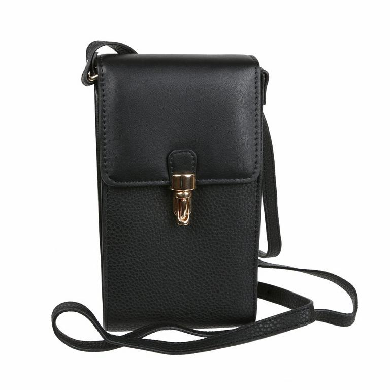 Atraktívne koženkové puzdro v čiernej farbe. Mini cross bag - puzdro na smarphone do veľkosti 5,5" s 2 priečinkami na drobné príručné veci (pas, mince, bankovky, karty, kľúče a pod.) s dlhým ramienkom.