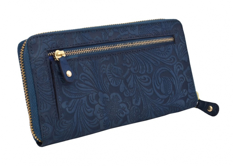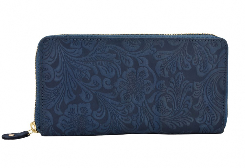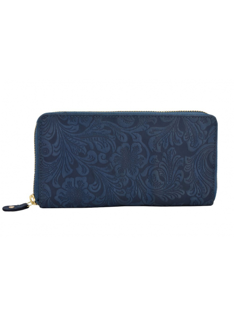 Elegantná dámska peňaženka MERCUCIO tmavomodrej farby. Listová peňaženka s elegantnou brúsenou potlačou kvetov. Vejárovité otváranie, uzatváranie zipsom v zlatej farbe.