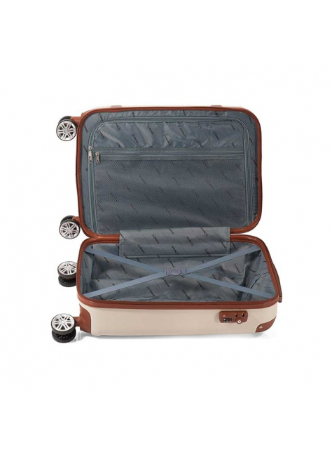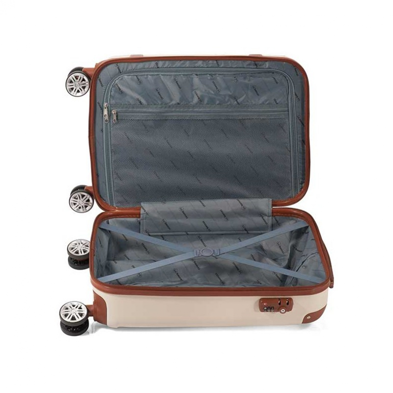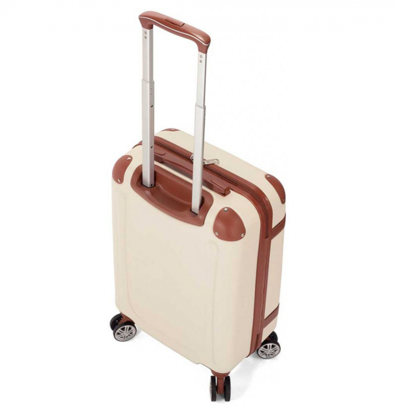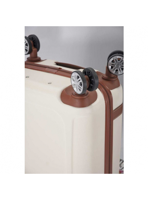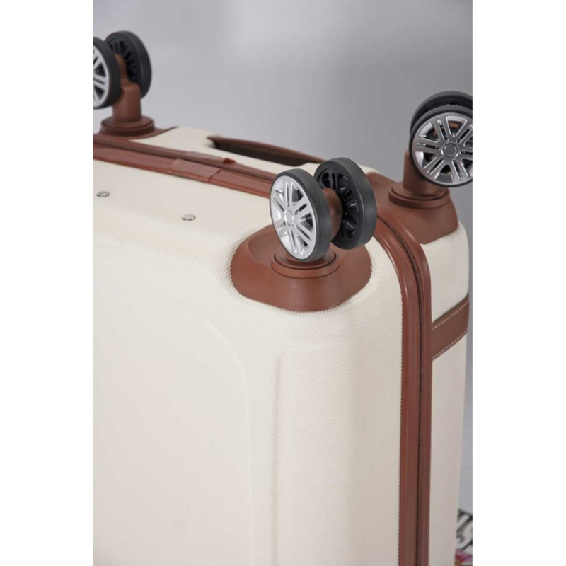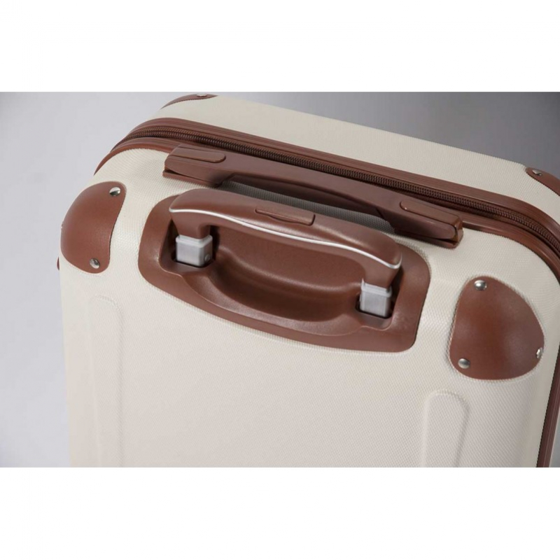 Kufor má 4 viacsmerové kolieska z tvrdeného plastu. K prenášaniu je kufor vybavený plastovou rúčkou a výsuvným teleskopickým držiakom. Vysoko elegantný vzhľad v prevedení v šedej v kombinácii s hnedou.