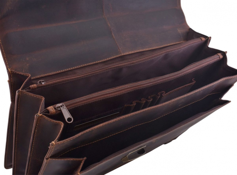 - 3 samostatné veľké komory š 39 x v 27 x h do 6 cm pre dokumenty A4 a 2 ploché predeľujúce na zips (vnútri 1-vej komory: puzdro na mobil 16x8x2-3, 4 kožené slučky na perá, 3 priehradky na karty, zadná stena 3-tej komory s príručným priečinkom na zips 15x20x1 cm)