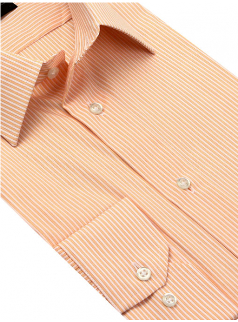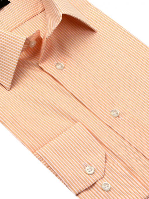 Športovo-elegantná pánska košeľa v klasickom voľnom strihu, dlhý rukáv, manžety so zapínaním na gombíky. Kvalitná tkanina z bavlny a lycry so vzorom jemných oranžových a bielych prúžkov.