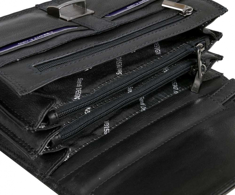 Jednotlivé oddelenia sú predelené plochými zipsovými priehradkami. V prednej vnútornej časti sa nachádza jedna voľná priehradka a kartové priečinky.
