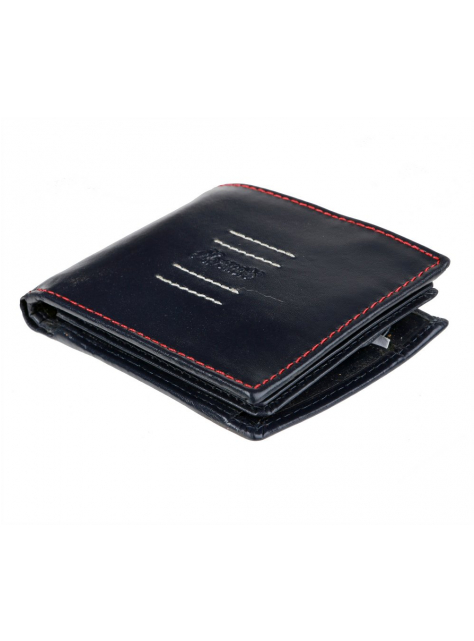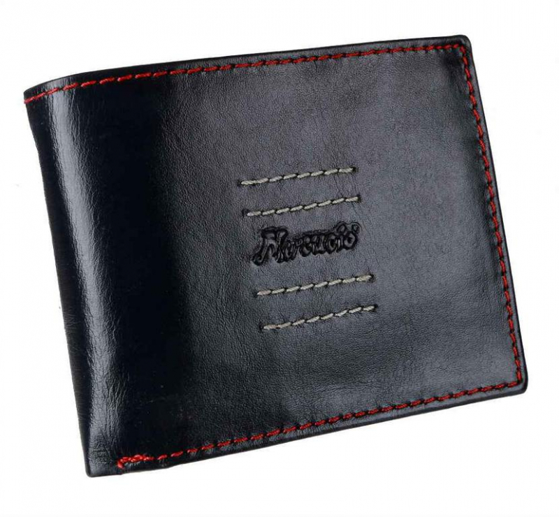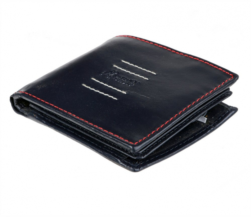 Peňaženka je ozvláštnená okrajovým štepovaním červenou niťou. Dokladová časť sa nachádza v ľavej časti peňaženky s vyklápaním do prava, pre väčšiu bezpečnosť je zopnutá prackou.