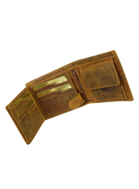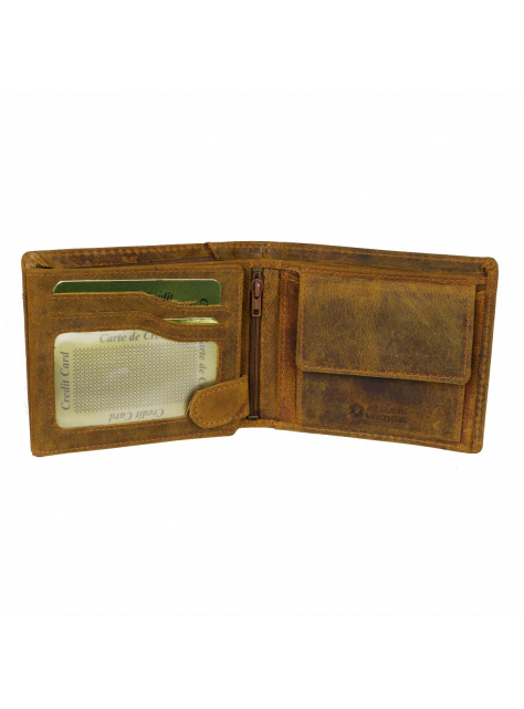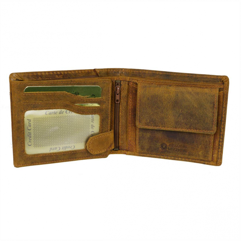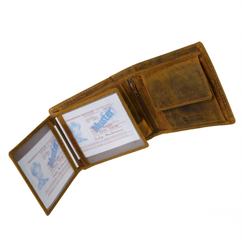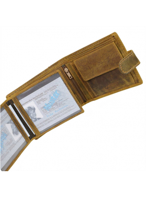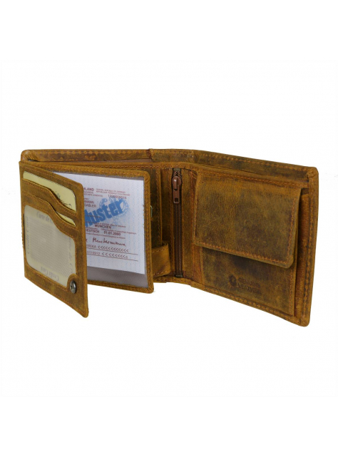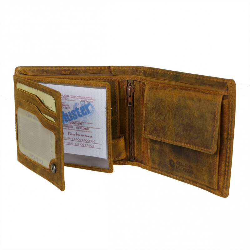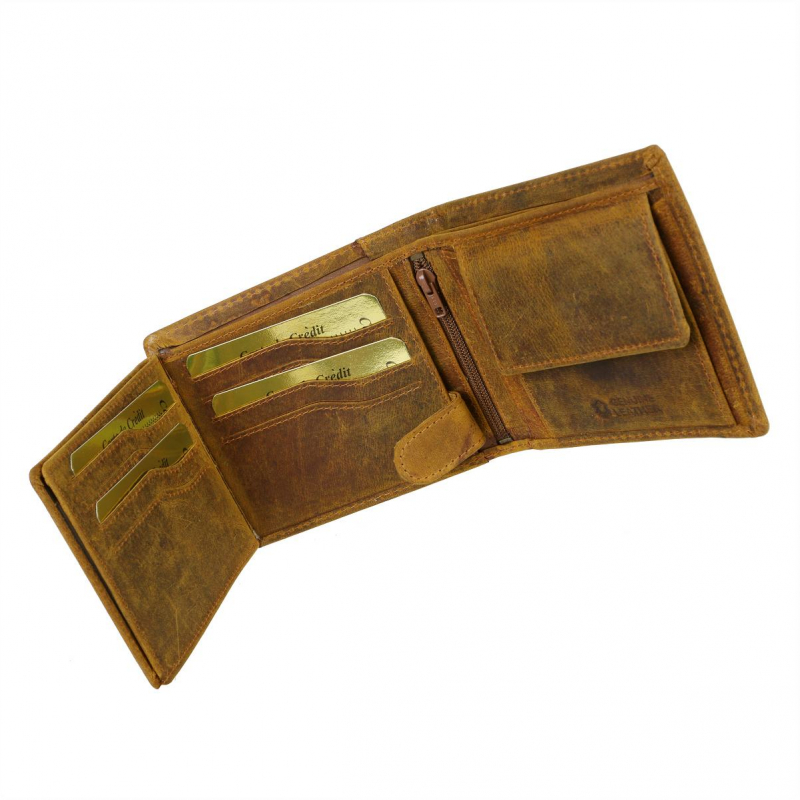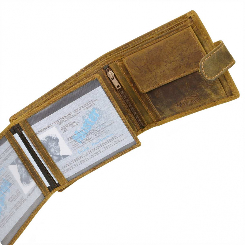 Pánska peňaženka hnedo-žltej farby z príjemne mäkkej a hladkej brúsenej kože s prešívaním. Obľúbený praktický model s množstvom priečinkov a s veľkým skrytým priečinkom na zips - klasický formát na šírku s vnútorným zapínaním na pracku s patentom a s prehľadne usporiadanou čaťou pre karty a doklady formou prekládacích listov.