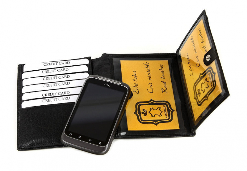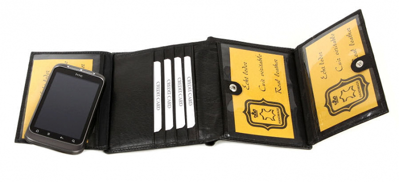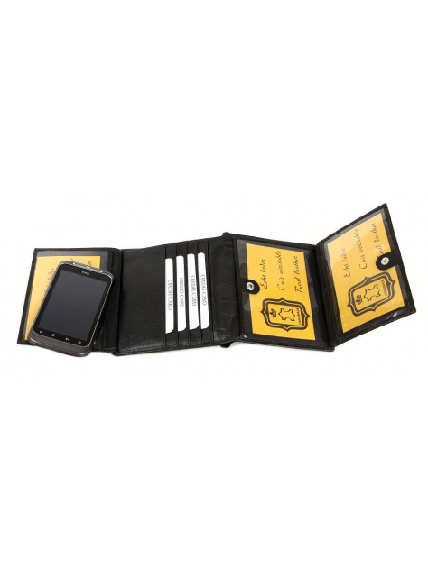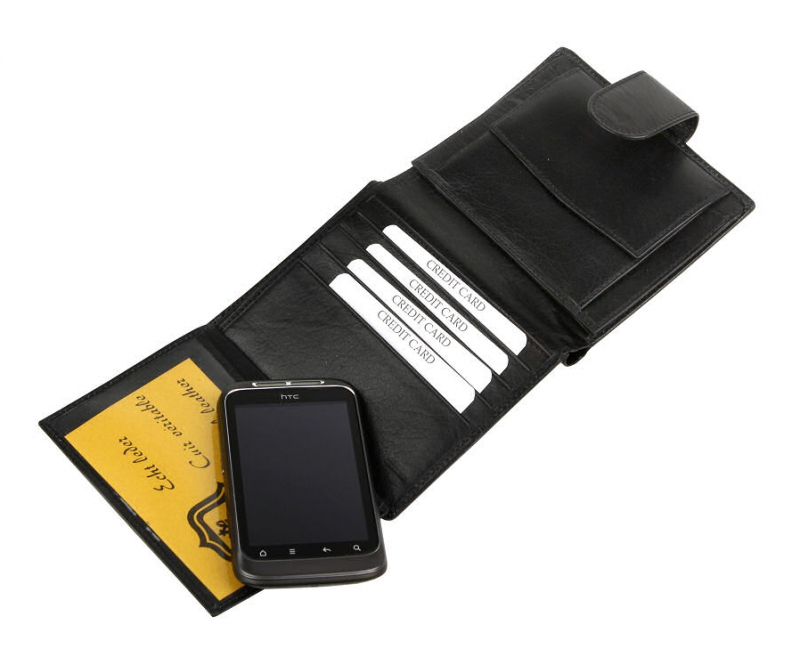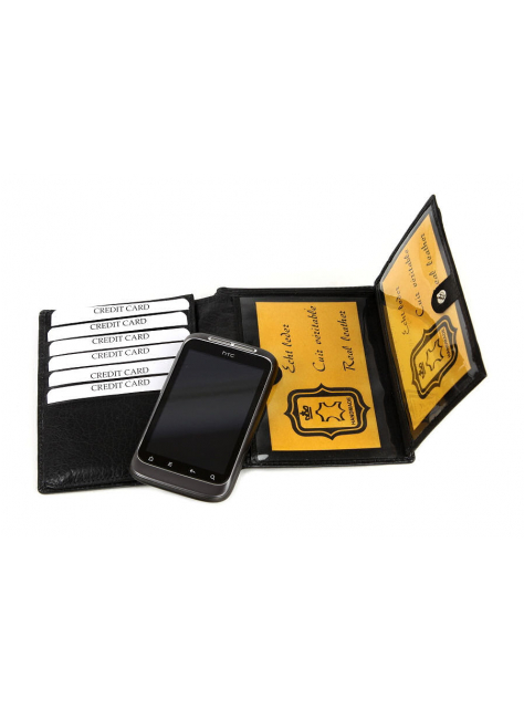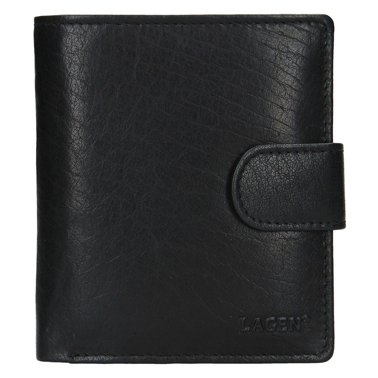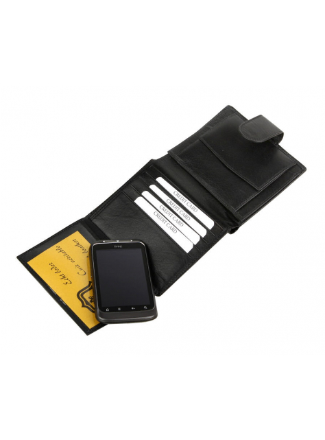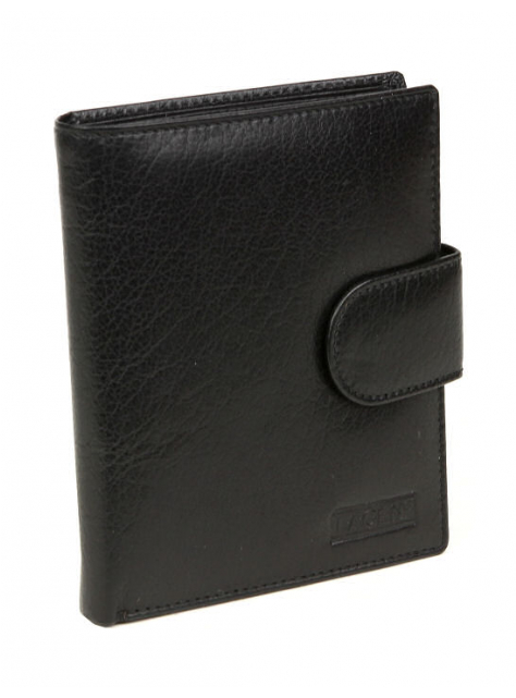 Pánska kožená peňaženka - elegantný model v čiernej koži. Zapínanie na pracku, vnútro zopnuté prackou. Vysoký formát v klasickej veľkosti, ktorá vyhovuje aj pre starší typ dokladov.