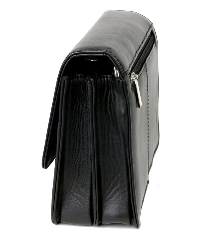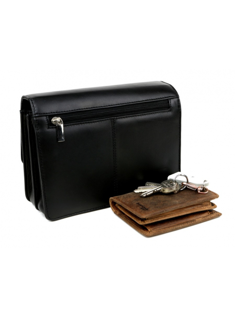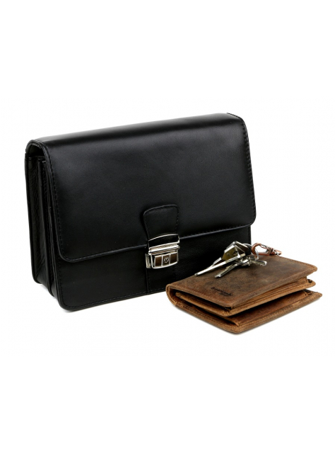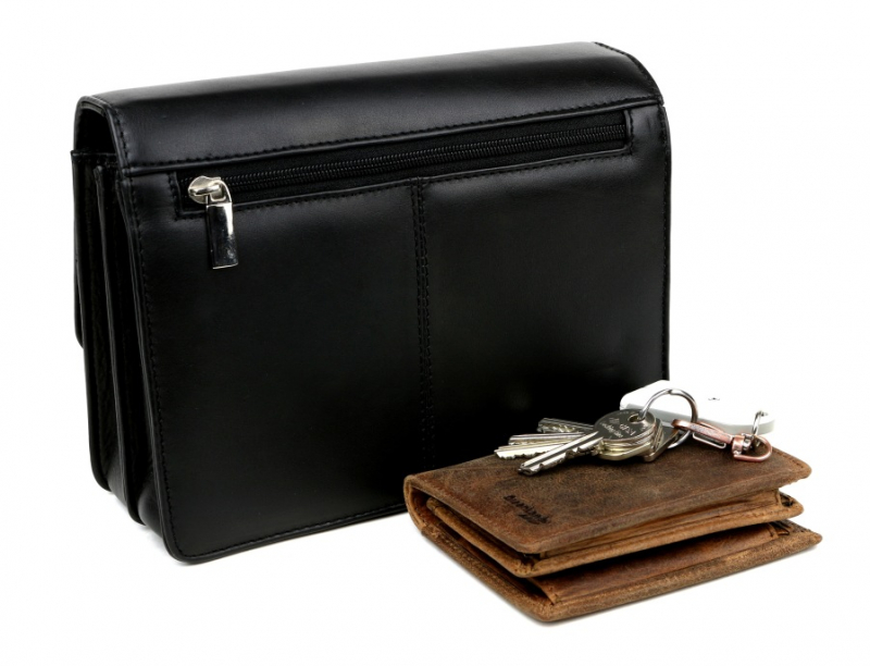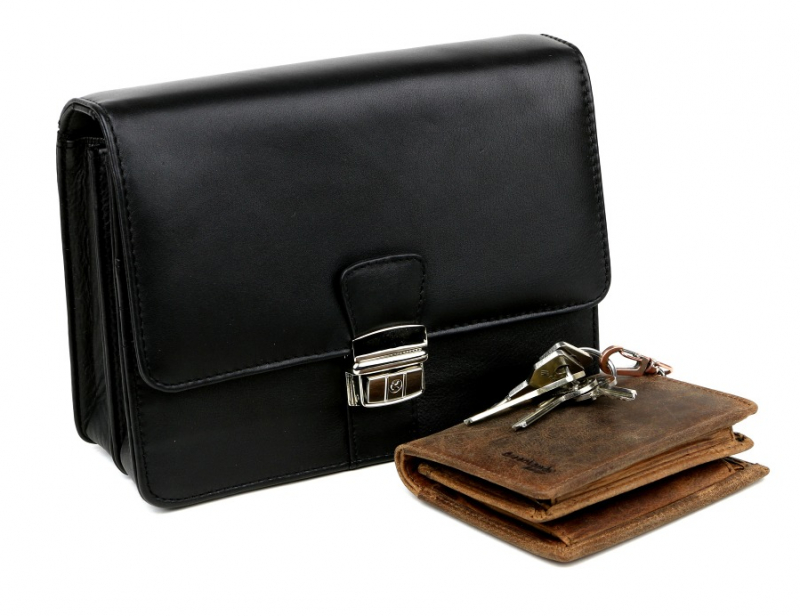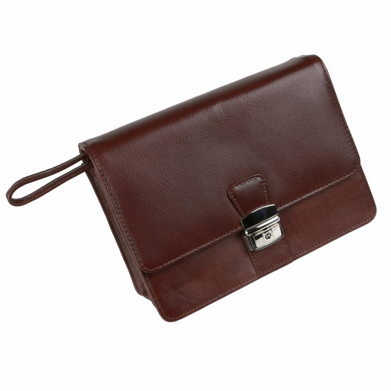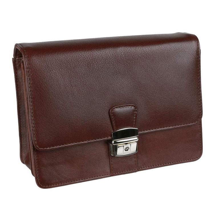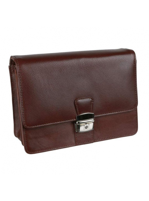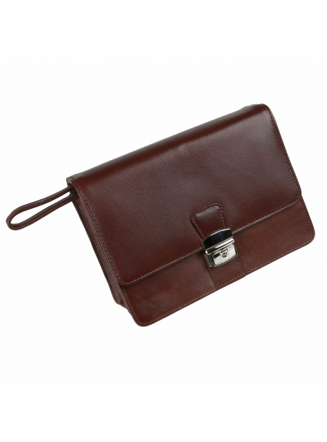 Kožená pánska etue na doklady z hladkej matnej kože v hnedej farbe, zmäkčená úprava, príjemná na dotyk. Pánska taška väčšieho typu s 2 vnútornými priehradkami a organizérom. Taška má nízku hmotnosť a praktickú veľkosť pre bežné osobné veci. Zapínanie na kovovú pracku. Nosenie do ruky alebo za bočnú rúčku.