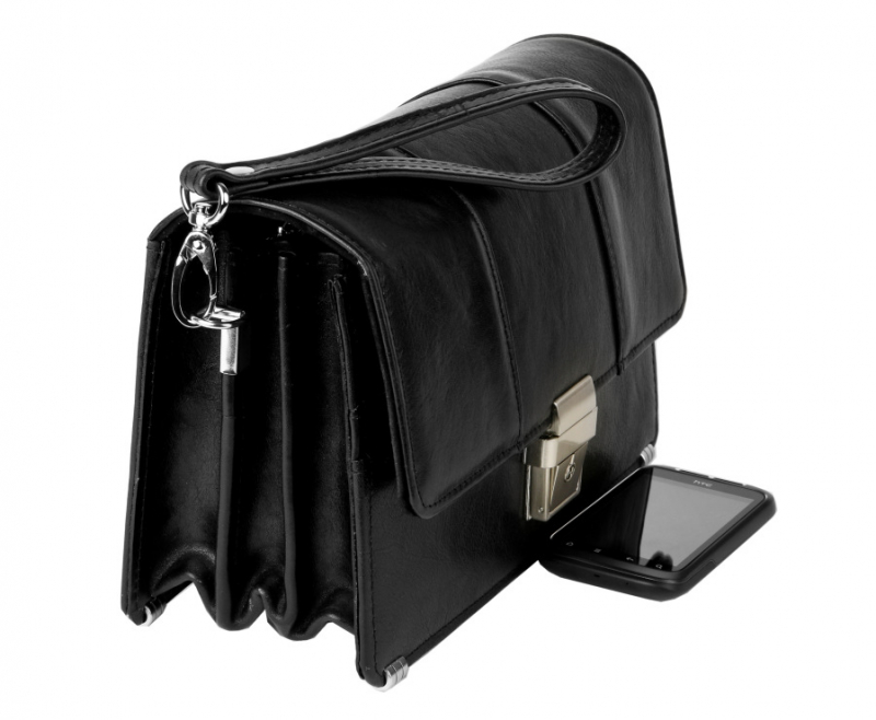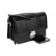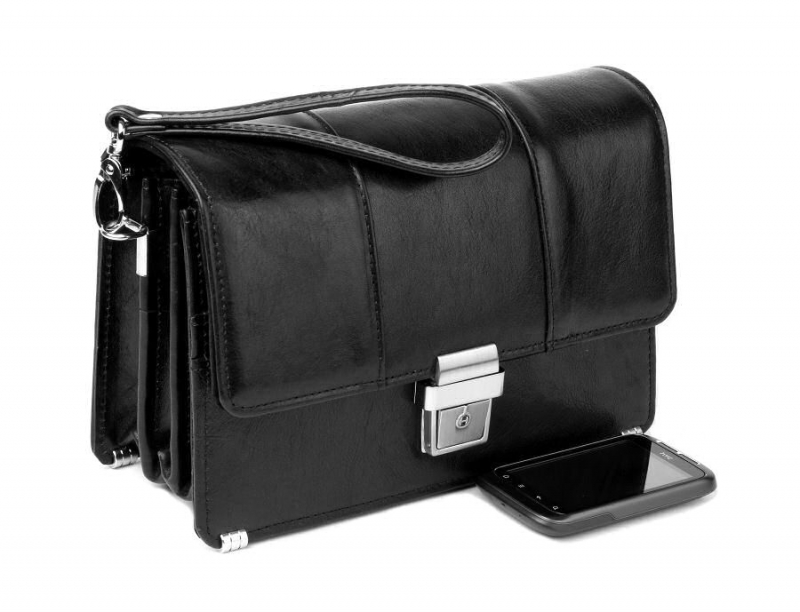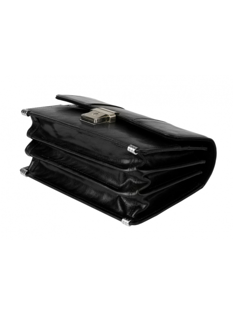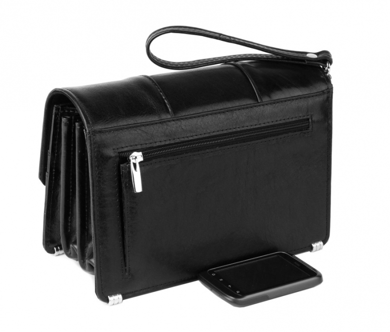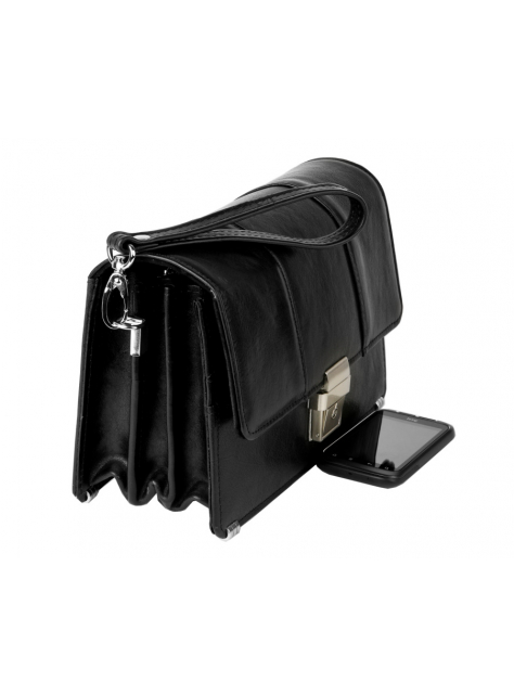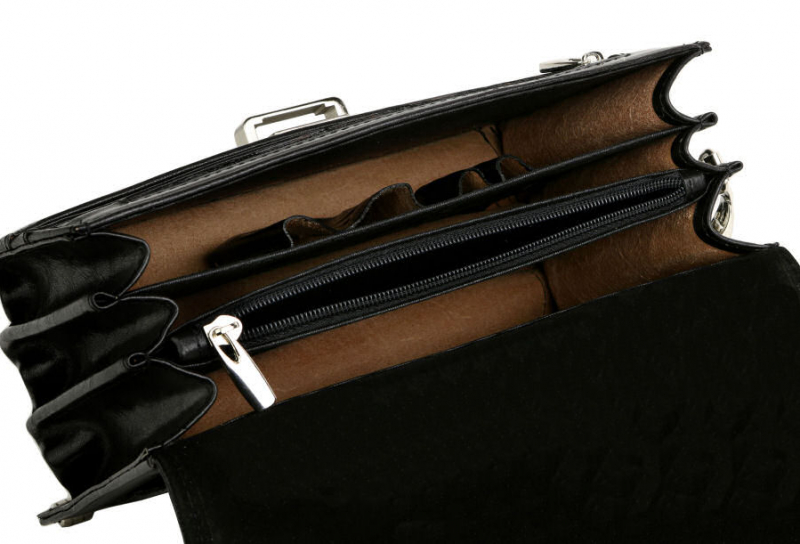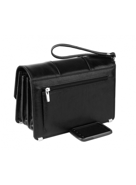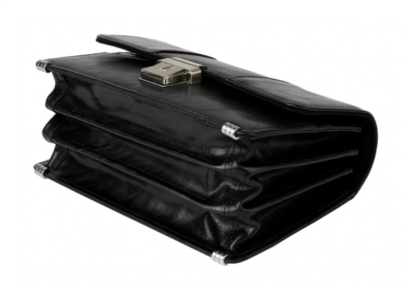 Pánska príručná taška väčšieho typu - 3 voľné priehradky, 1 úzka zipsová priehradka, predné priečinky na karty (vizitky). Čierna leštená koža v pevnom a masívnom prevedení, hladký povrch. Úchop za bočnú koženú rúčku (odnímateľná, na karabínke) aleb nosenie v ruke, 4 kovové podstavce.