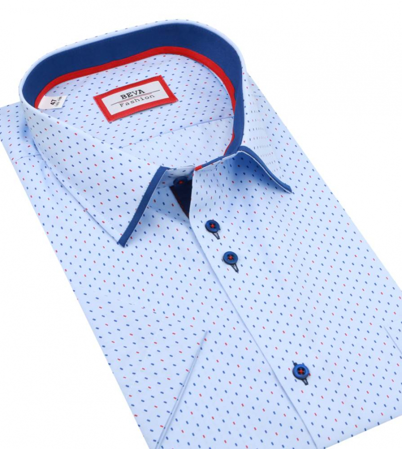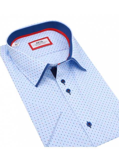 Exkluzívna modrá košeľa BEVA FASHION s krátkym rukávom. Košeľa klasického voľného strihu v nadmerných veľkostiach vyhovuje na výšku postavy 182 - 188 cm.
