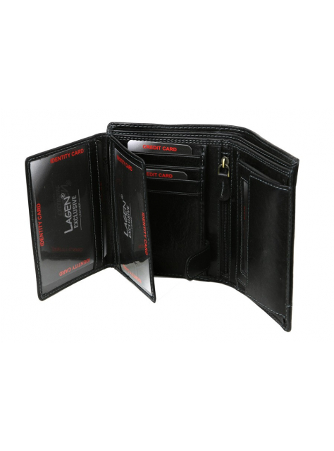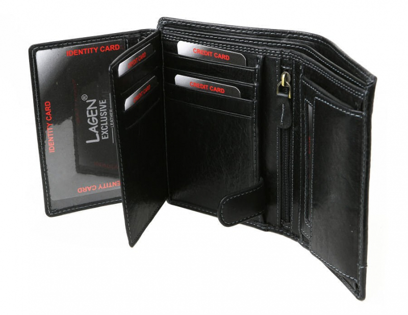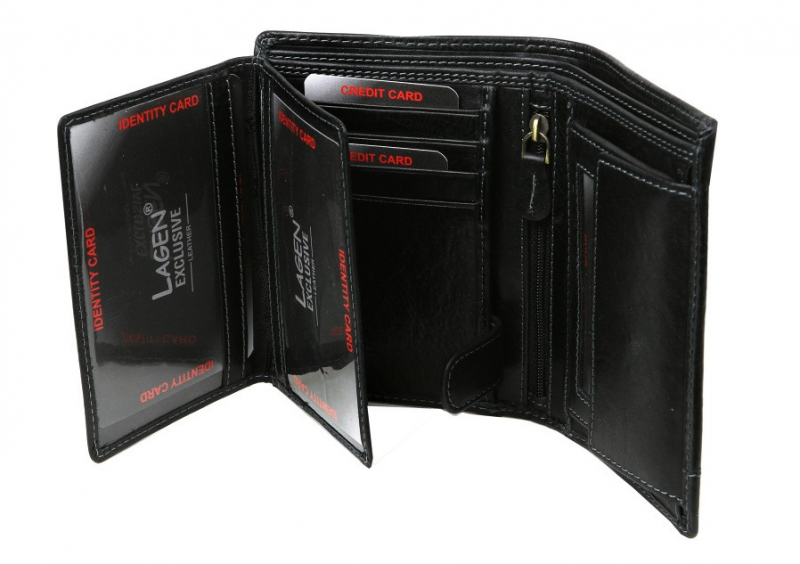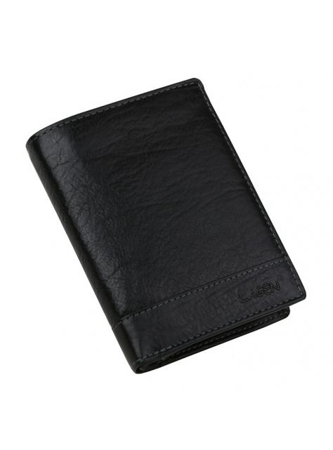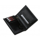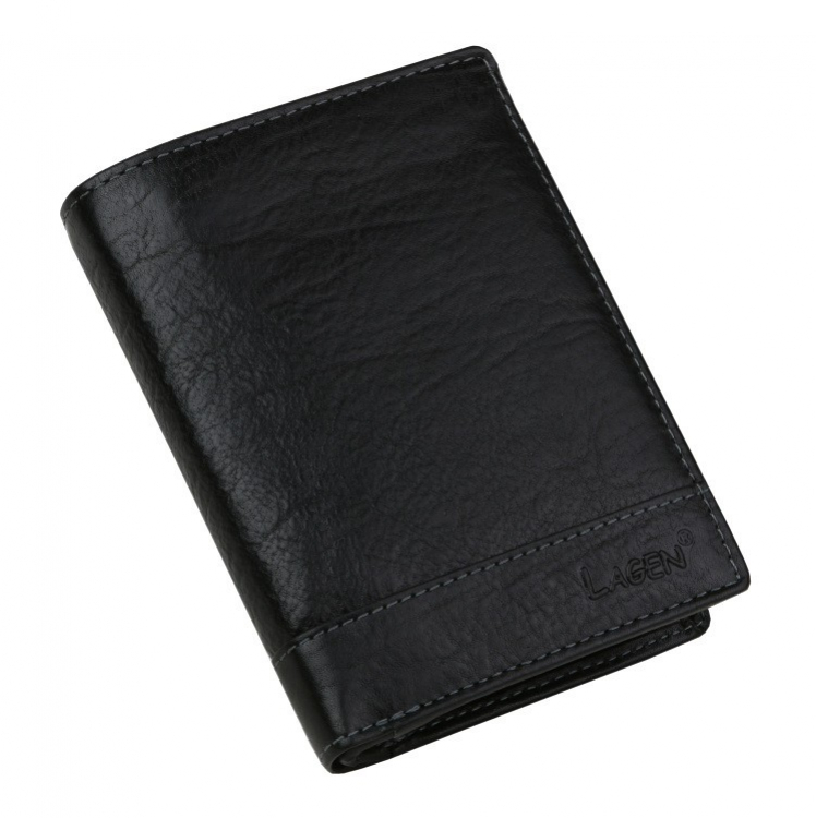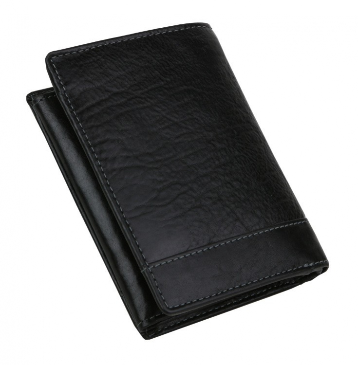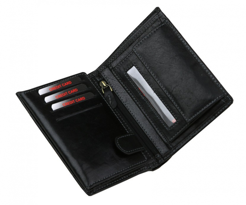 Pánska kožená peňaženka - elegantný model v čiernej koži. Vnútorná kartová a dokladová časť zopnutá prackou, skrytý obojstraný priečinok. Vysoký formát v klasickej veľkosti, ktorá vyhovuje aj pre starší typ dokladov.
