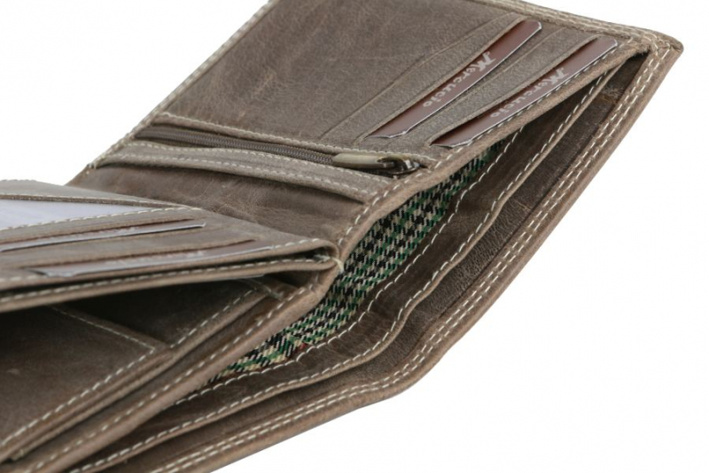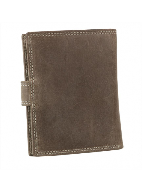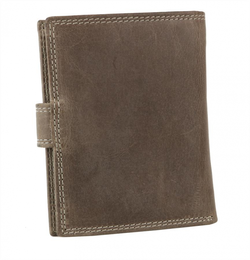 Pánska peňaženka tmavohnedej farby zo zamatovo hladkej kože s prešívaním. Model so zapínaním na kovový patent, formát na výšku.