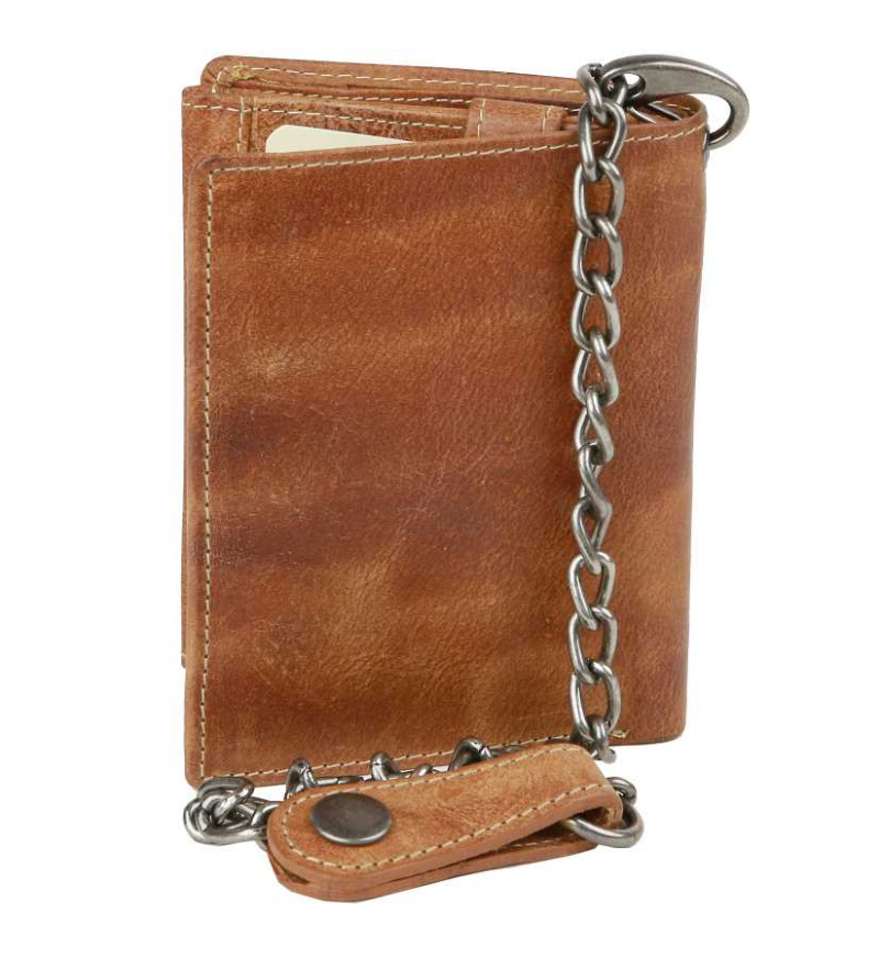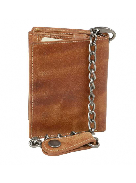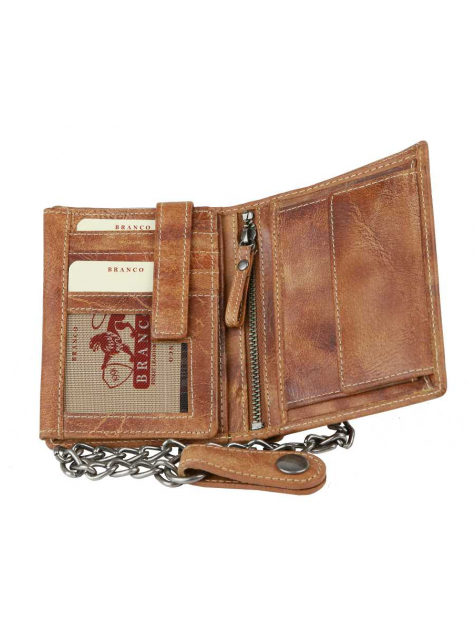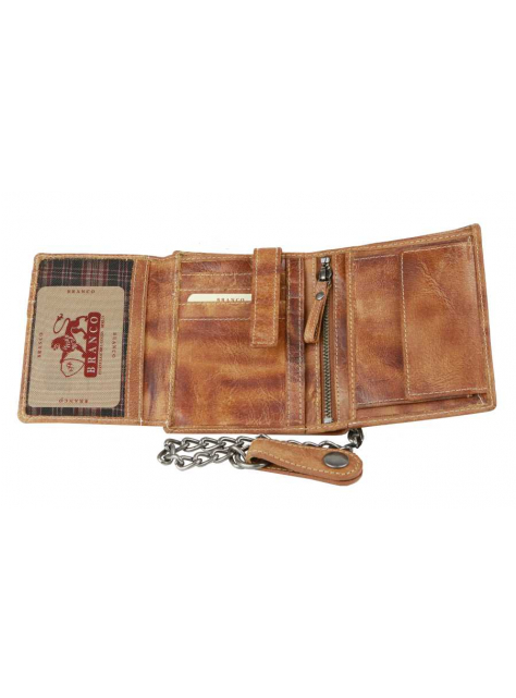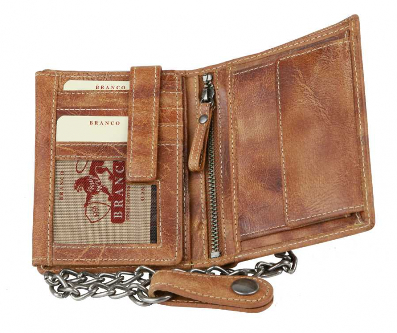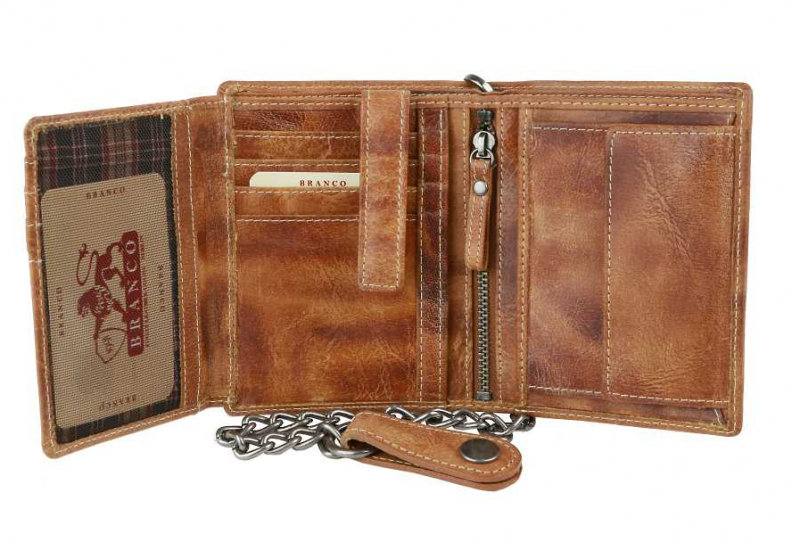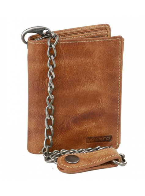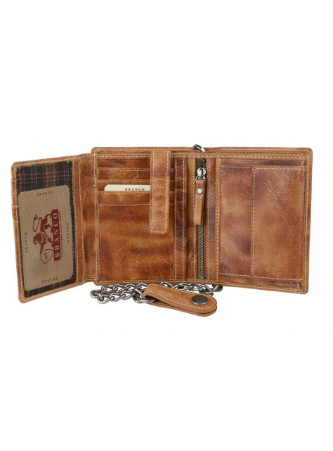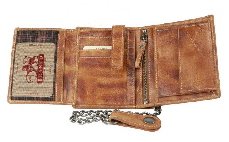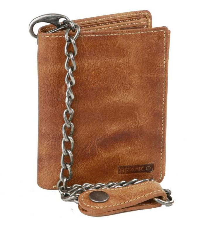 Kožená pánska peňaženka BRANCO z pravej kože výbornej kvality bez zapínania, formát na výšku. Koža je v modernej hnedej farbe. Obsahuje tiež odopínateľnú retiazku s karabínkou.