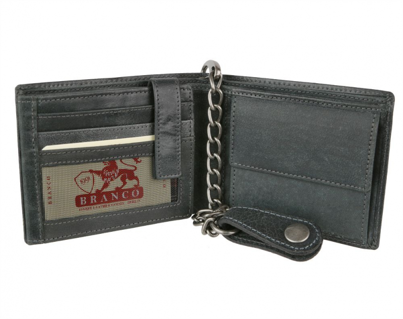 Štýlová pánska peňaženka BRANCO z pravej kože výbornej kvality bez zapínania, formát na šírku. Koža je v čierno-šedej farbe vo vintage úprave.