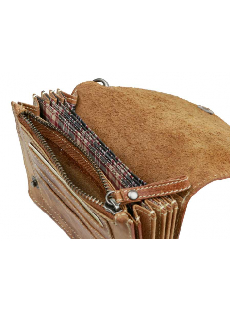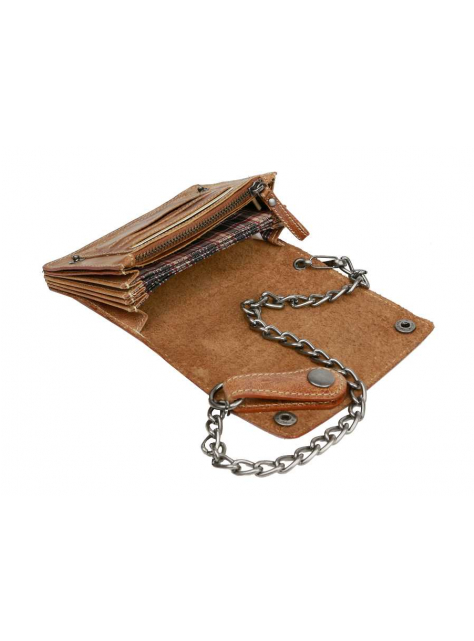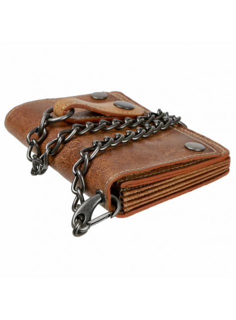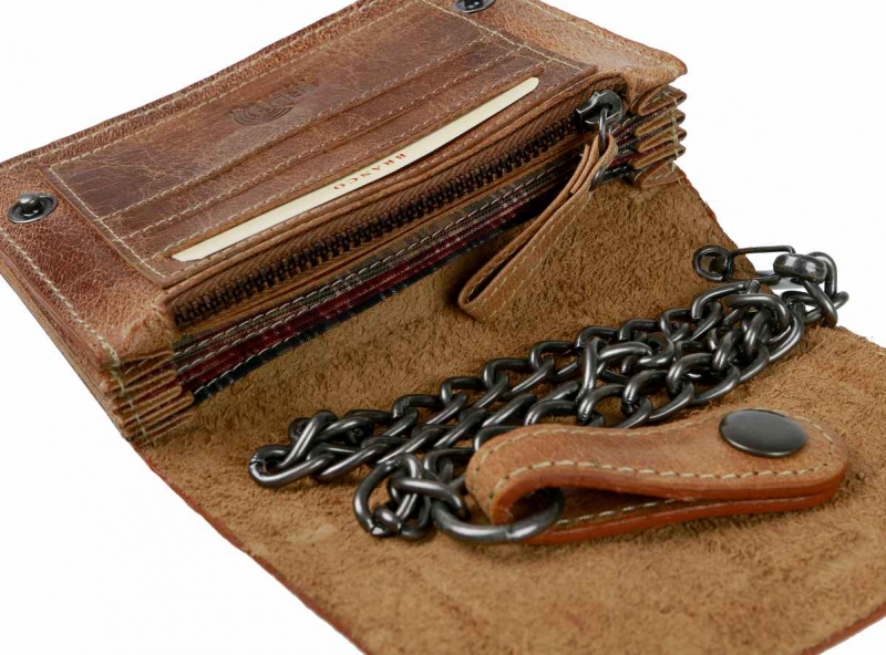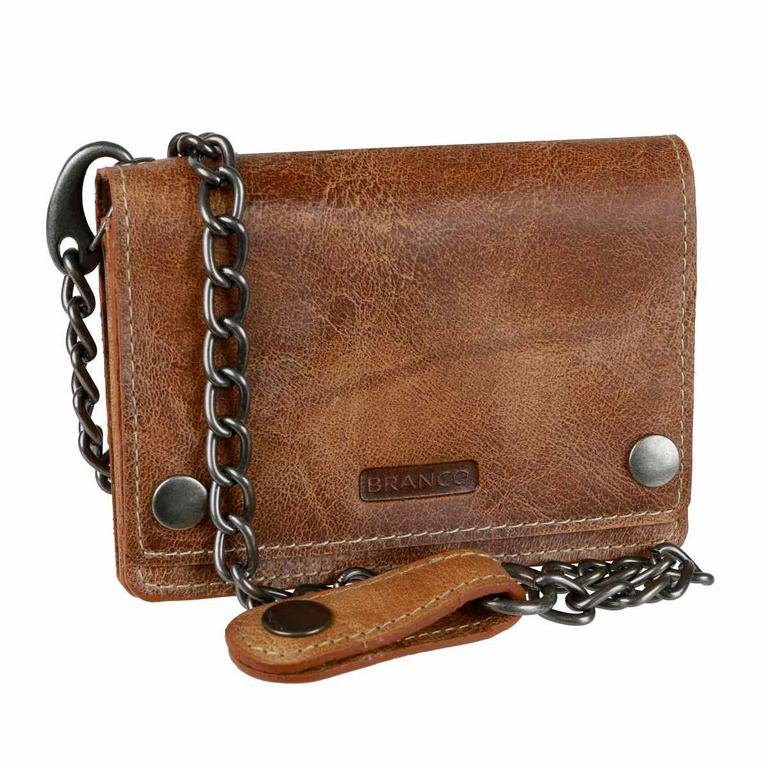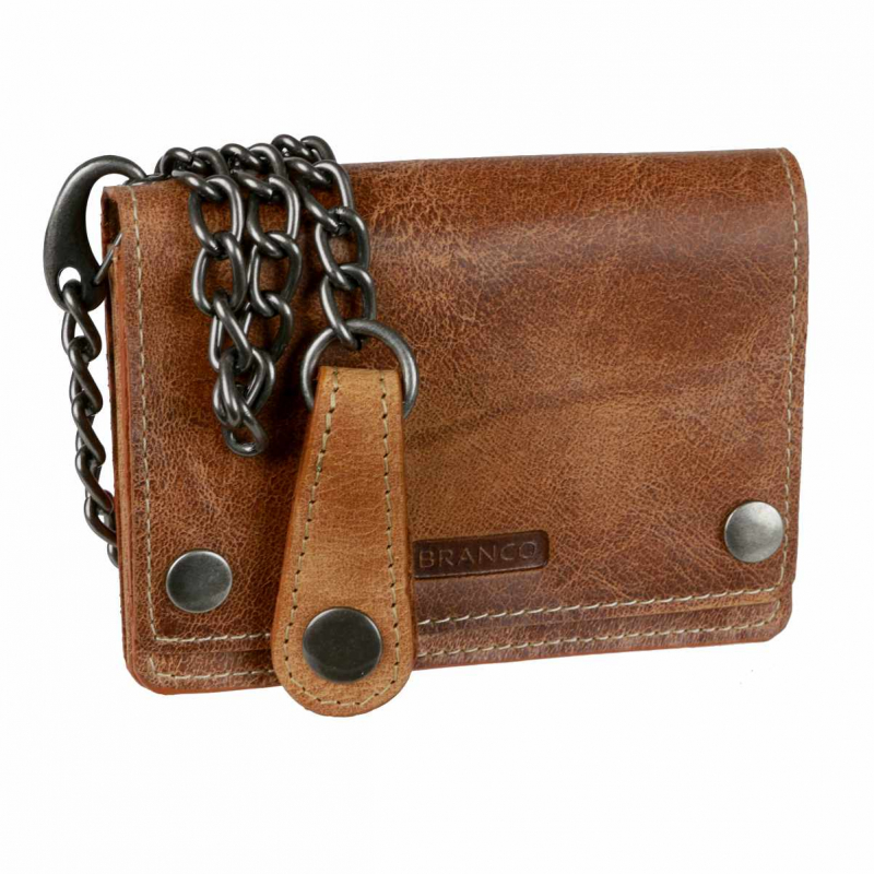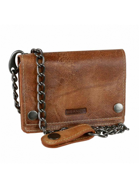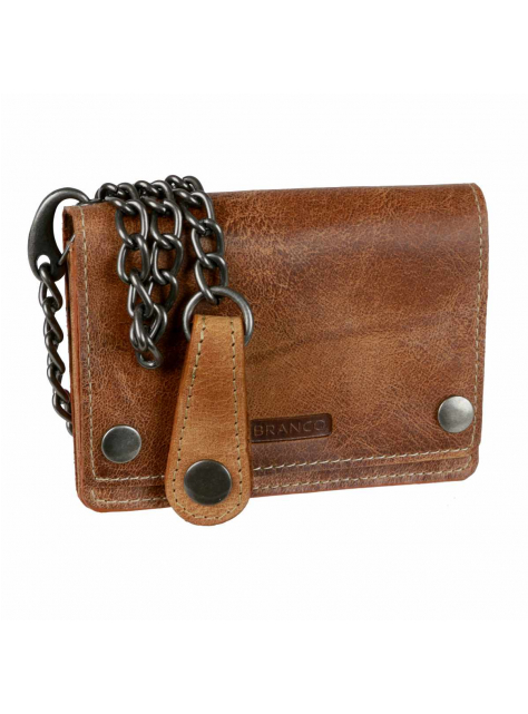 Kožená peňaženka BRANCO z pravej kože výbornej kvality so zapínaním prednej chlopne na 2 patenty. Koža je v hnedej farbe. Obsahuje tiež odopínateľnú retiazku s karabínkou.