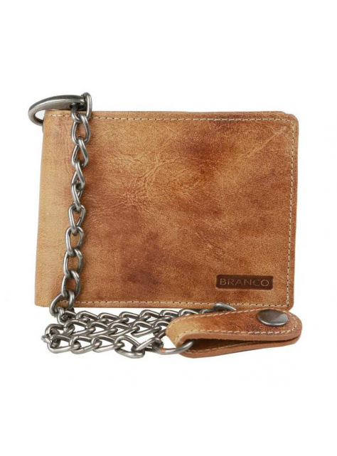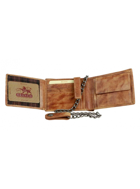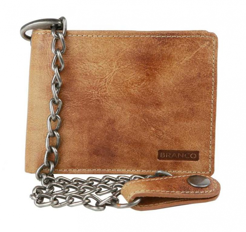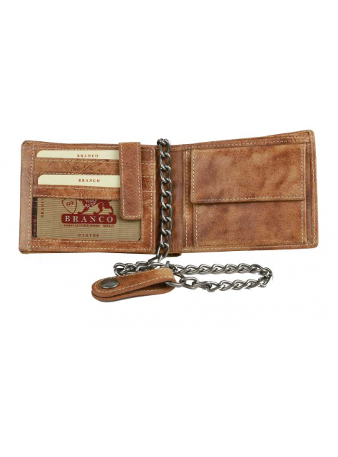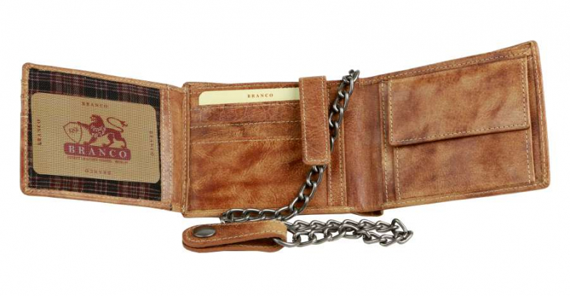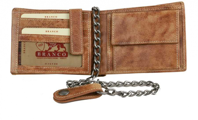 Kožená pánska peňaženka BRANCO z pravej kože výbornej kvality v hnedej farbe. Formát na šírku vyhovujúci aj staršiemu typu dokladov. Súčasťou je odopínateľná retiazka s karabínkou dĺžky 40 cm, na konci pútko s patentom pre prichytenie na nohavice. Vnútri kartová a dokladová časť s vyklápaním do ľava so zapínaním na patent pre väčšiu bezpečnosť vašich kariet. Široký formát vyhovuje aj pre starší typ dokladov.