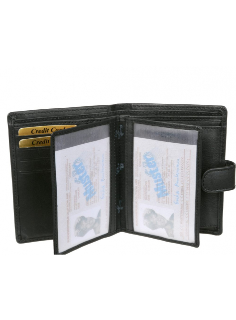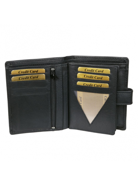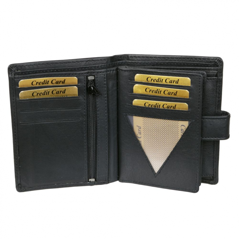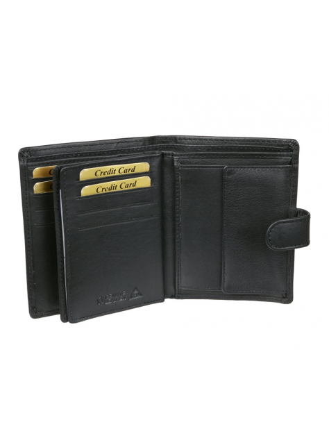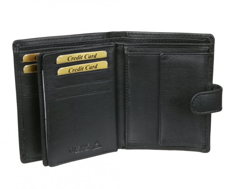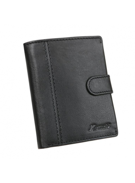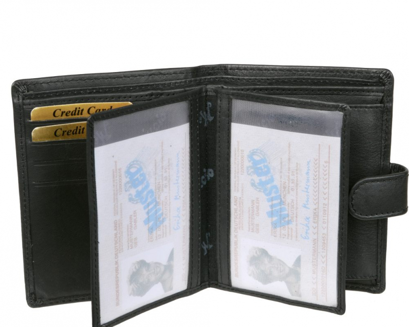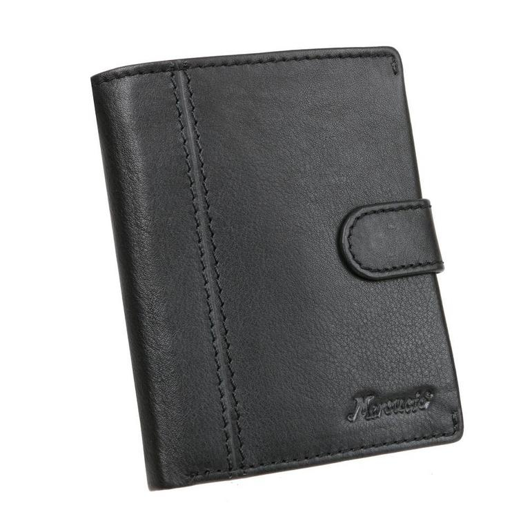 Čierna kožená peňaženka na výšku MERCUCIO rozmerov v 12,5 x š 9,5 cm. Peňaženka so zapínaním, klasický formát aj pre osobné doklady väčšieho typu.