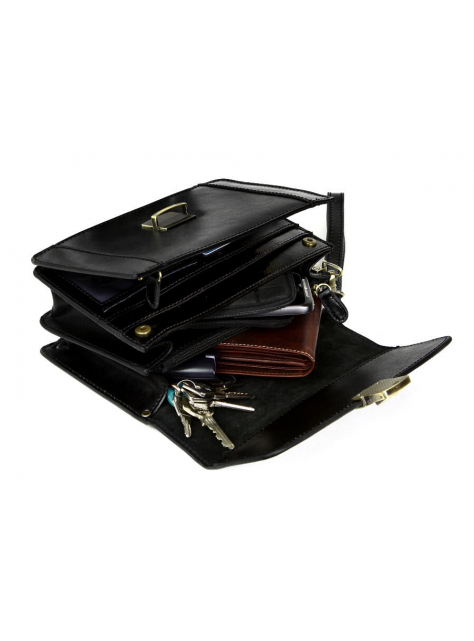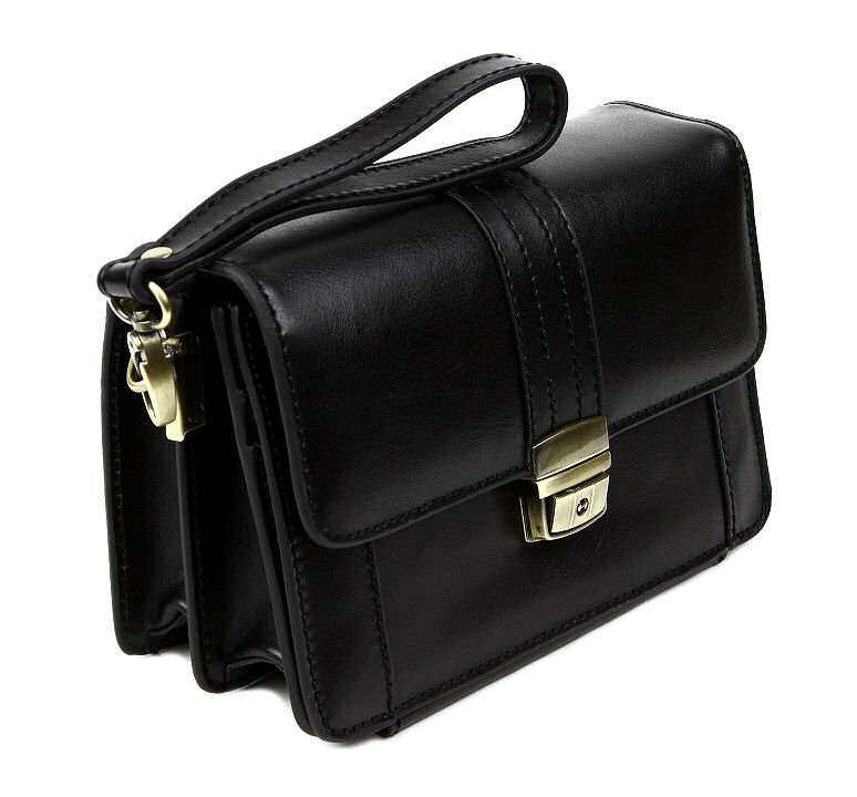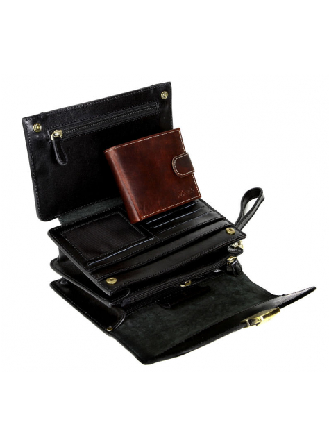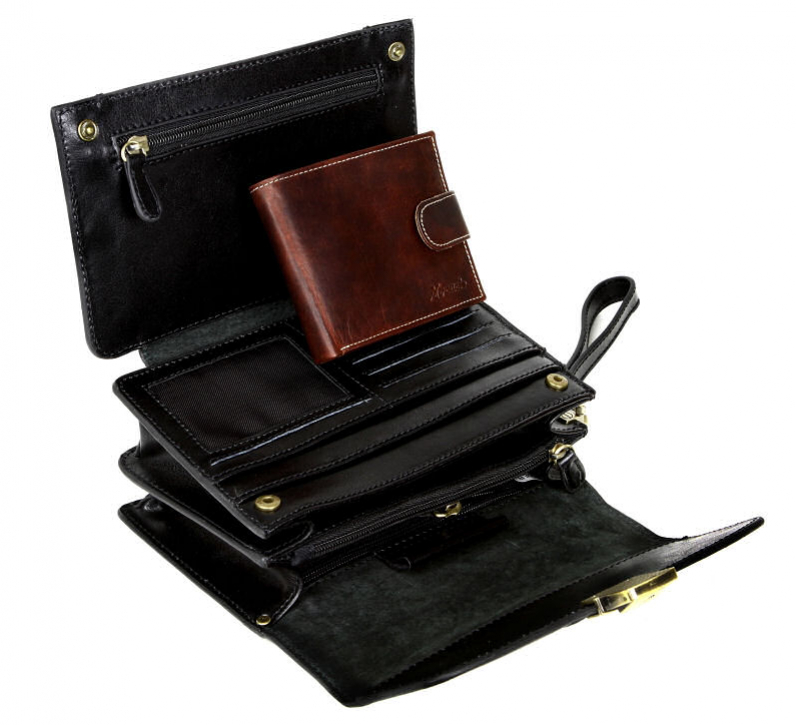 Pánska príručná taška - etue robustného vzhľadu vďaka pevnej hrubšej koži. Praktický formát s 2 komorami a predným príručným priečinkom na karty a poznámky (otváranie na 2 kovové patenty).