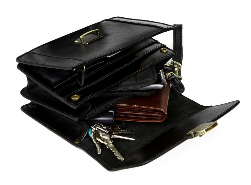 - vo vnútri púzdro na mobilný telefón, malý zipsový priečinok, úchyt na pero, poistka na uchytenie zväzku kľúčov