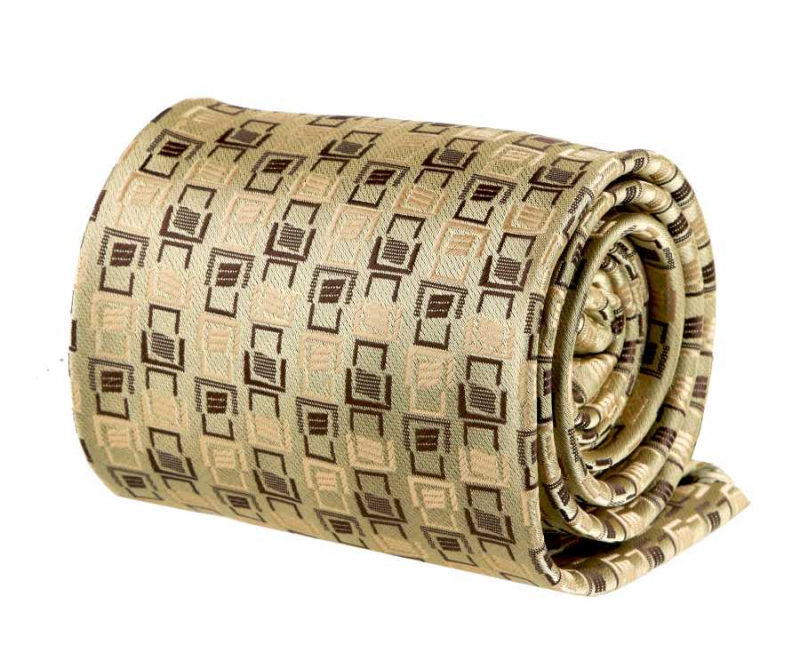 FAREBNÉ PREVEDENIE: zlatá kravata so vzorom v béžovo- žltej a tmavo hnedej farbe