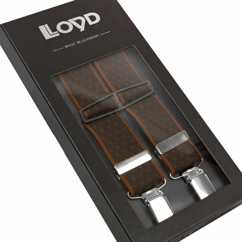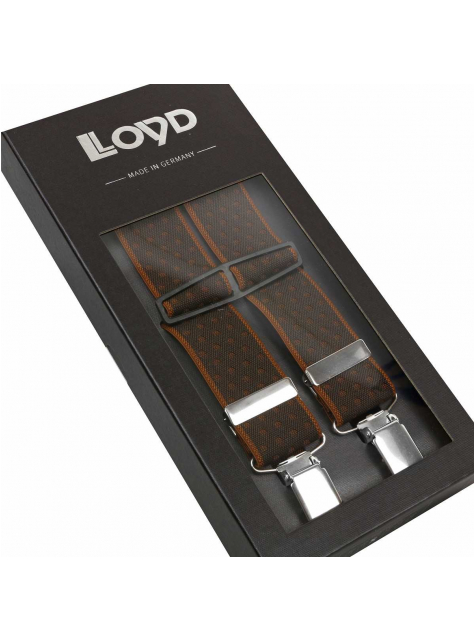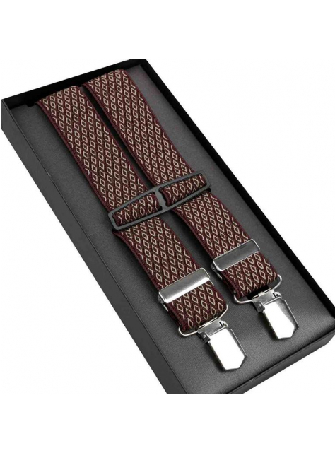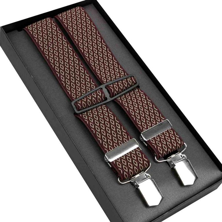 Exkluzívne pánske traky značky LLOYD s masívnejšími klipsami - kvalitný materiál a vypracovanie. Športovo-elegantné prevedenie, drobno-tkaný vzor béžových kosoštvorcov na tkanom bordovom podklade.