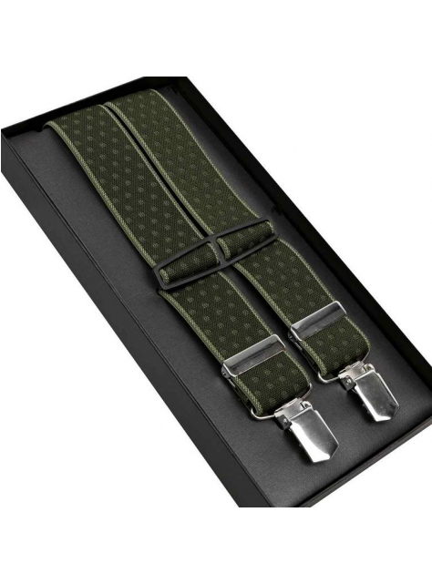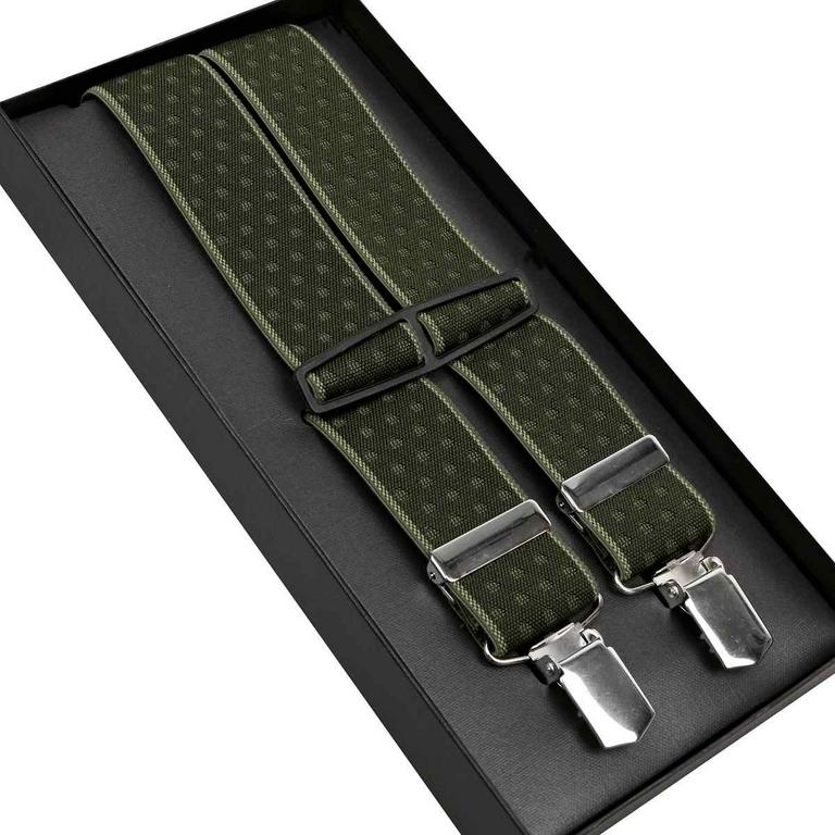 Exkluzívne pánske traky značky LLOYD s masívnejšími klipsami - kvalitný materiál a vypracovanie. Športovo-elegantné prevedenie, jemný tkaný lem a drobno-tkaný vzor bodiek svetlej farby kaki na tmavom kaki podklade.