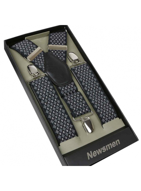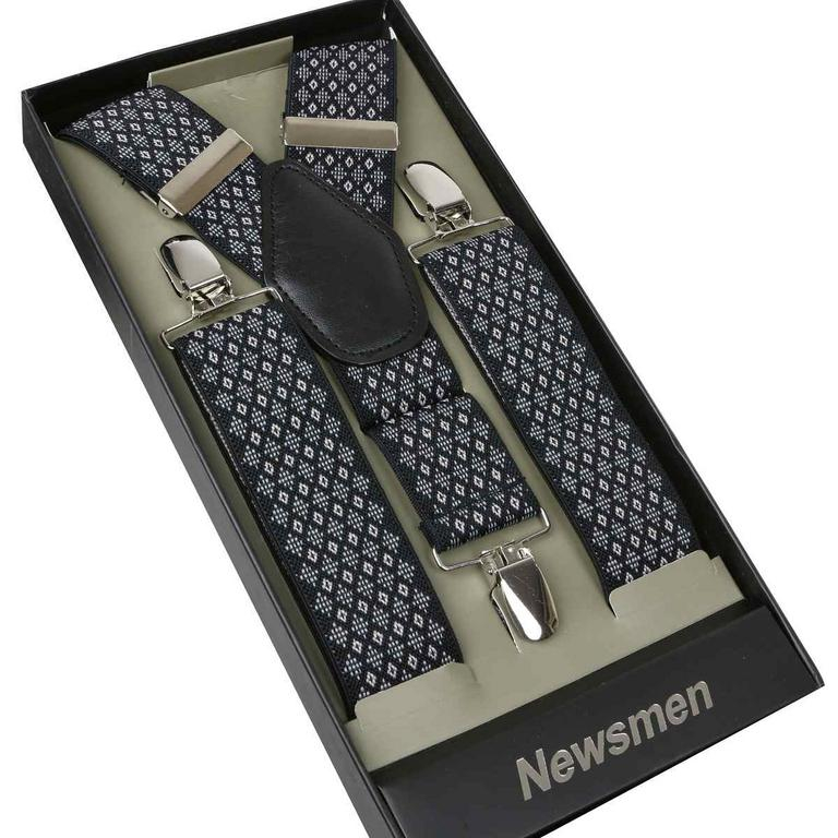 Pánske traky značky NEWSMEN s moderným vzorom. Športovo-elegantné prevedenie, tkaný vzor jemných béžových kosoštvorcov na čiernom podklade, kvalitné vypracovanie.