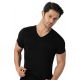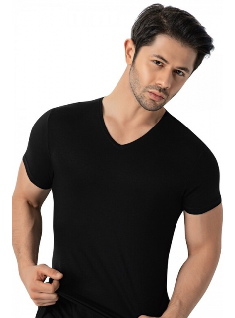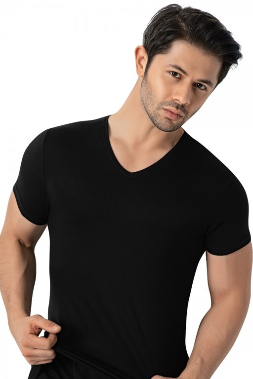 Pánske elastické čierne tričko s krátkym rukávom a V-výstrihom z bambusového materiálu. Hladká tkanina, na dotyk príjemná, elastická.