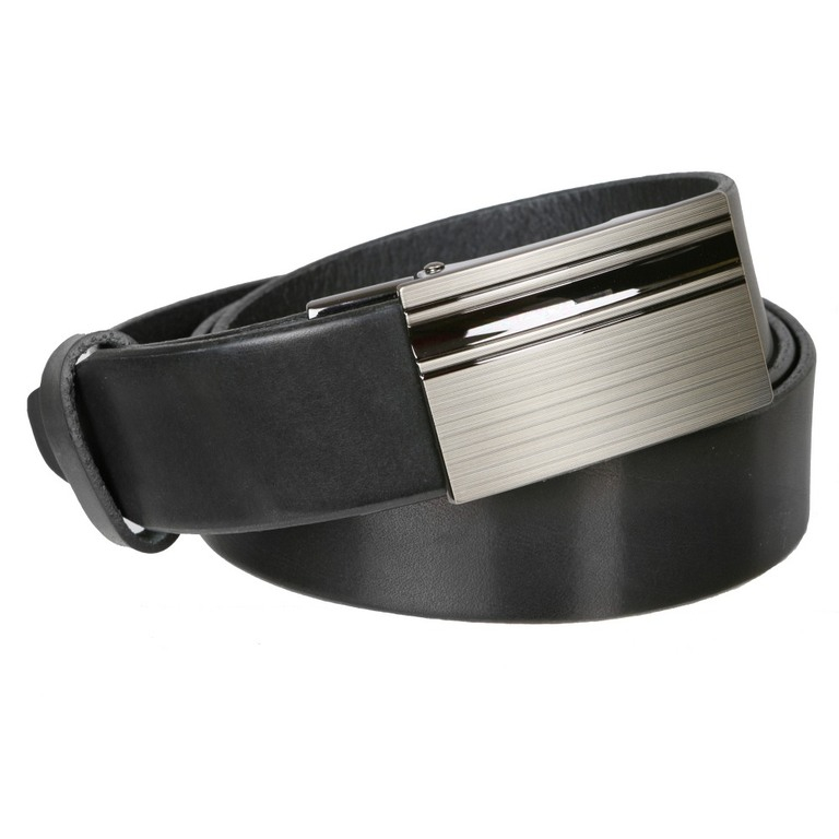 Kožený pánsky opasok vhodný do obleku na bežné aj príležitostné nosenie - gravírovaná satinovaná pracka z masívneho kovu so zapínaním na automatický zaklapovací mechanizmus.