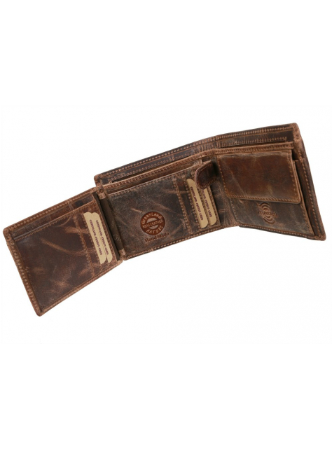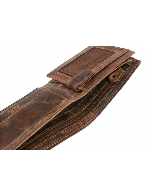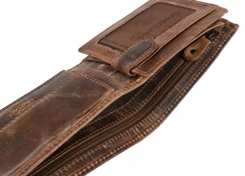 Pánska peňaženka s vnútornou prackou pre kartovú a dokladovú časť a so skrytou zipsovou priehradkou v priestore pre bankovky. Vyrobená z kvalitnej masívnej kože v hladkej úprave so starožitnou patinou. Voskovaný povrch, mierne krčený.