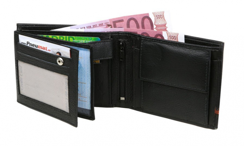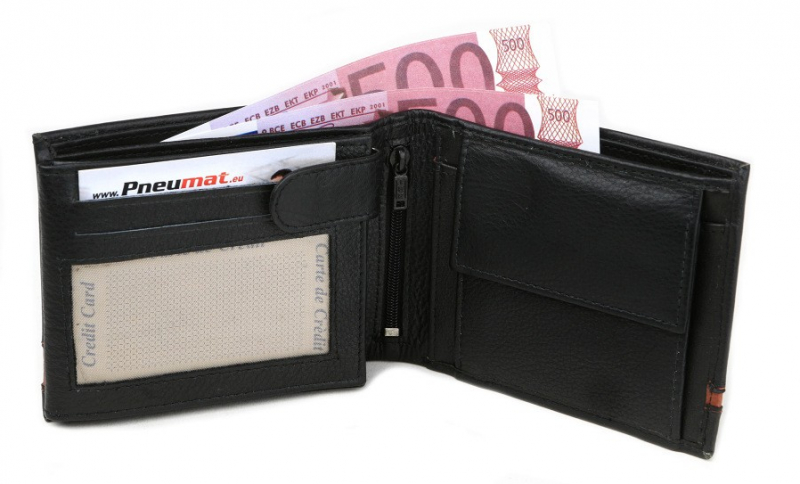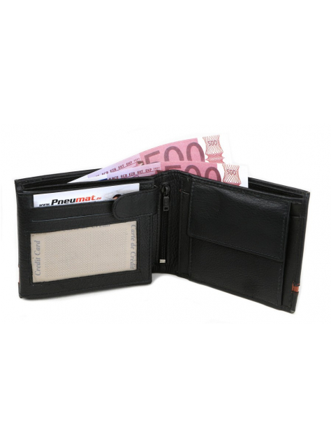 Pánska kožená peňaženka v širokom formáte. Vnútorná dvojdielna časť na karty a doklady je zopnutá prackou. Koža v hladkej úprave.