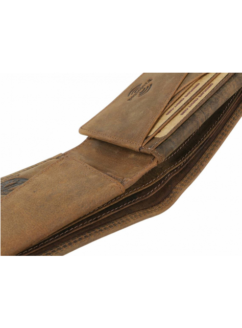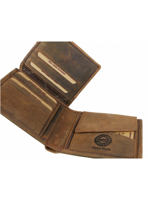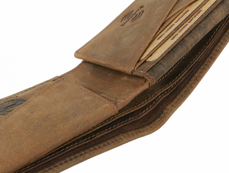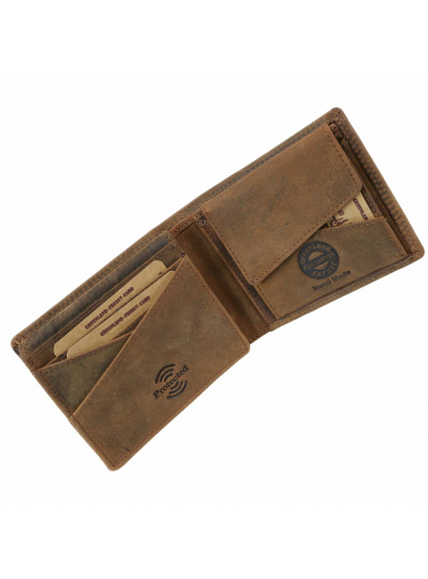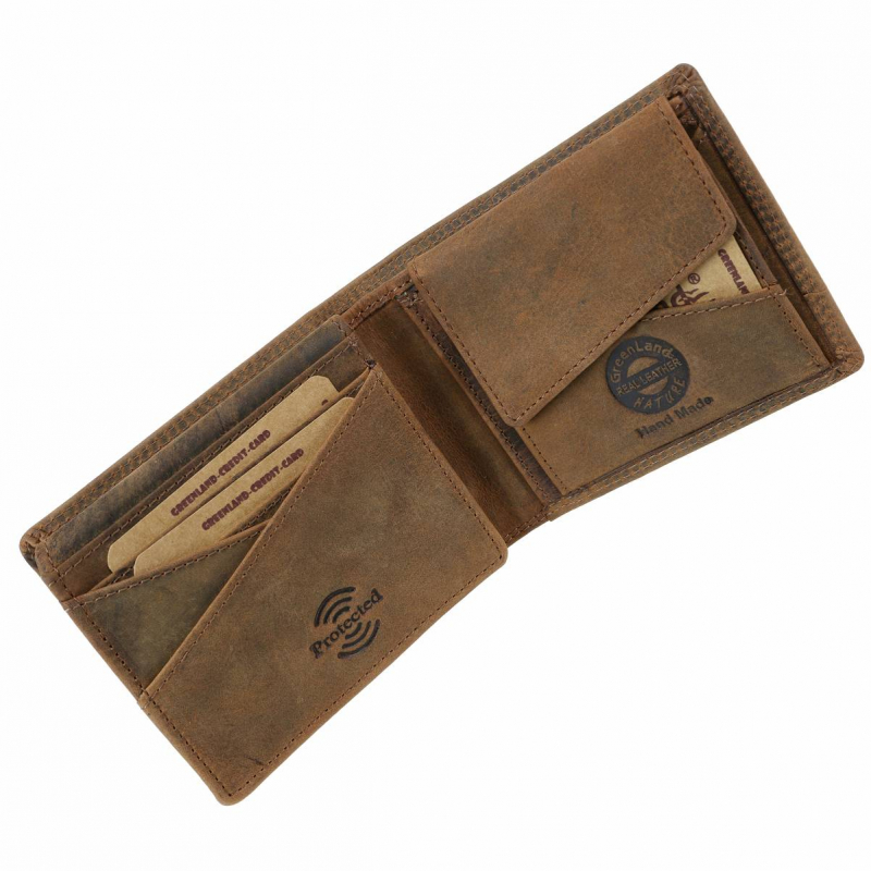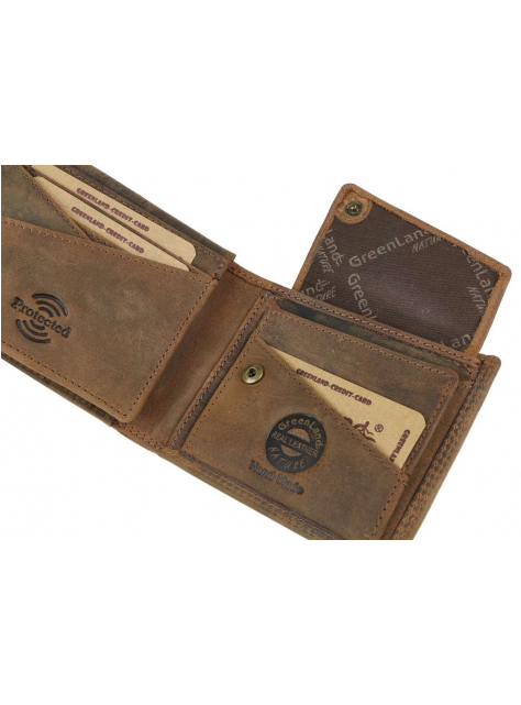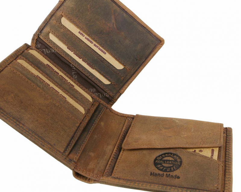 Kvalitná pánska peňaženka GreenLand Nature - z robustnej kože prémiovej kvality s jemne brúseným povrchom. Dokladová a kartová časť s vyklápaním v hornom smere, priestranný mincovník so širokým rozpätím, 3 oddelenia pre bankovky.