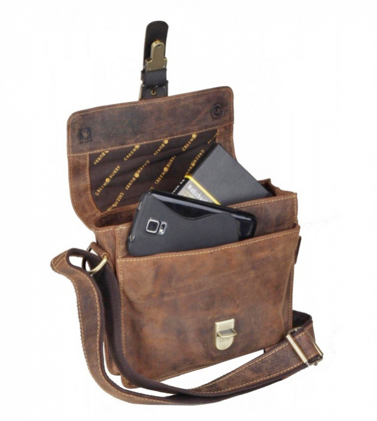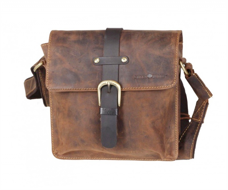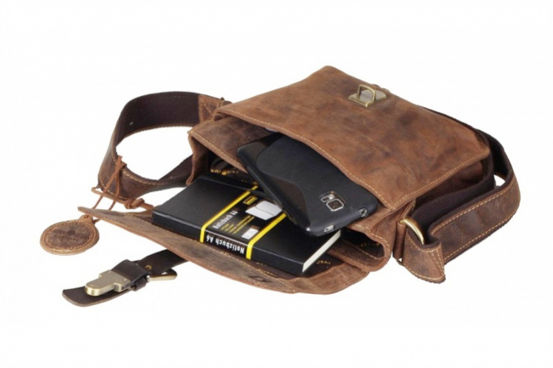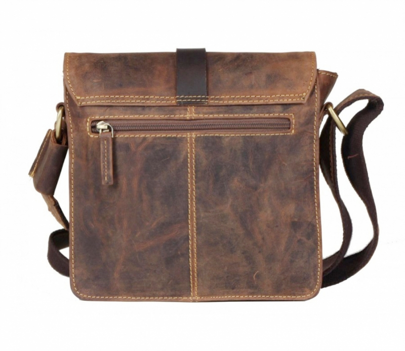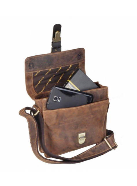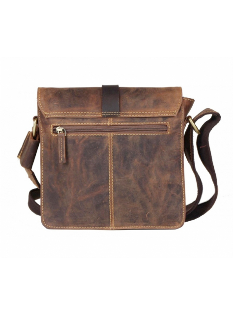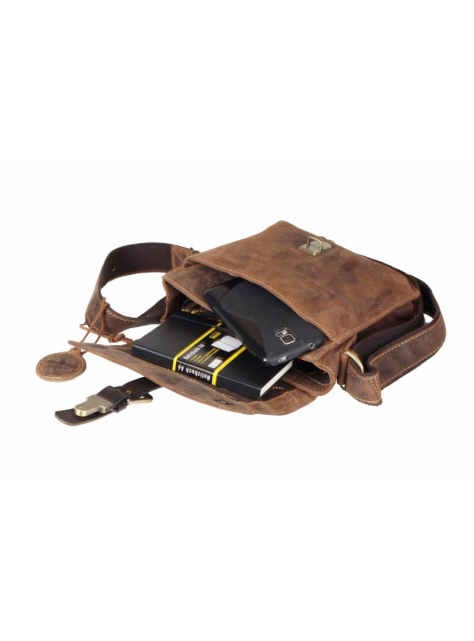 Kožená taška na rameno alebo cez plece zo série VINTAGE. Formát vhodný na základné príručné drobnosti. Uzatváranie na kovovú pracku (skrytá pod koženým remienkom so strmeňom).