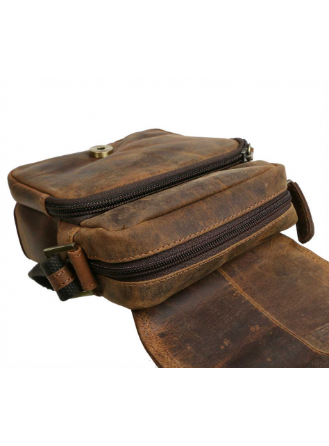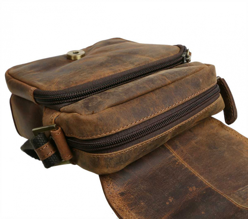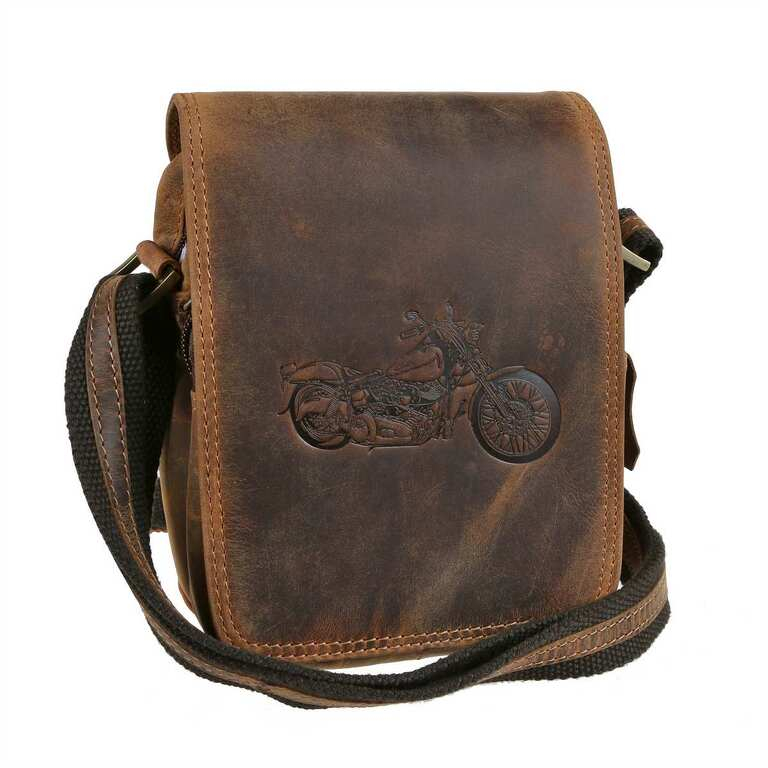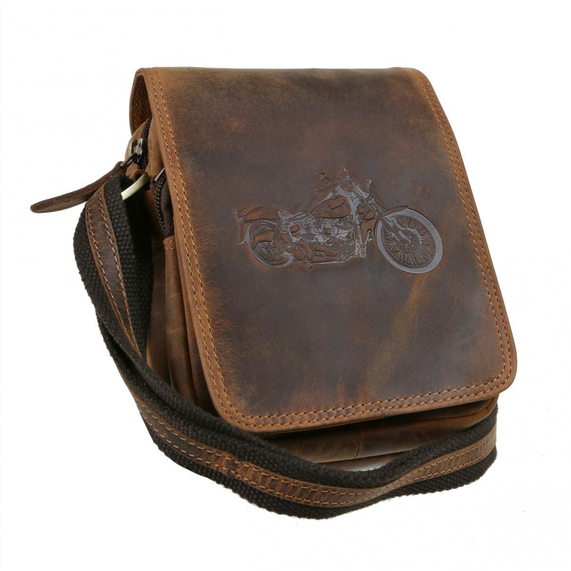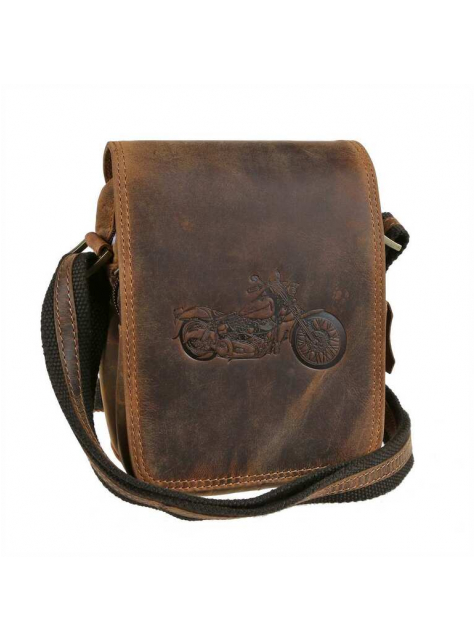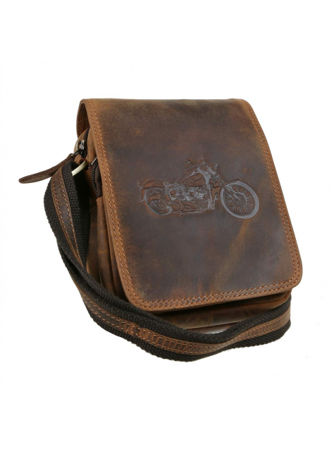 Kožená crossbag taška na rameno s chlopňou na magnet a 2 vnútornými priehradkami na zips. Chlopňa s vyrazeným motívom motocykla. Vyrobená z kože vo farebnom prevedení hnedá rustikálna. Nosí sa na ramene, cez plece popruh s nastaviteľnom dĺžkou do 165 cm (š. 2,5 cm).