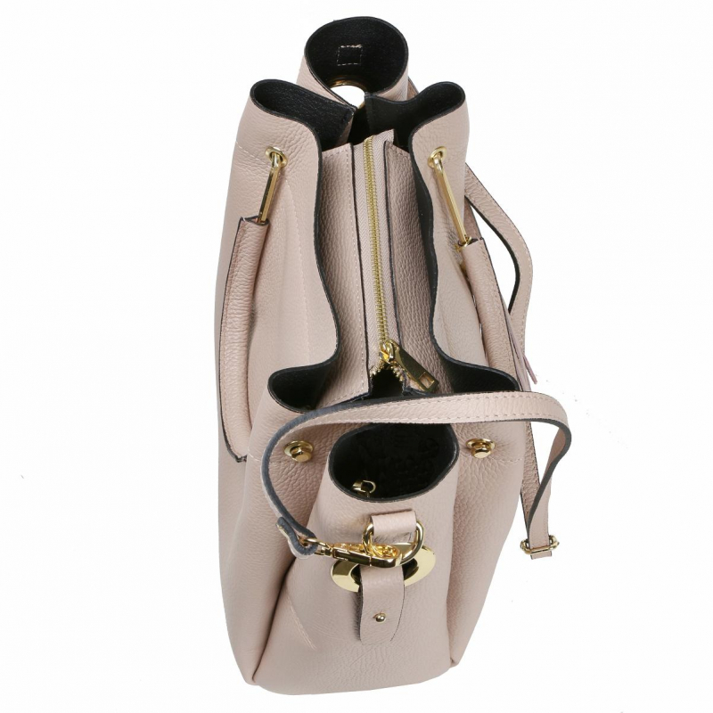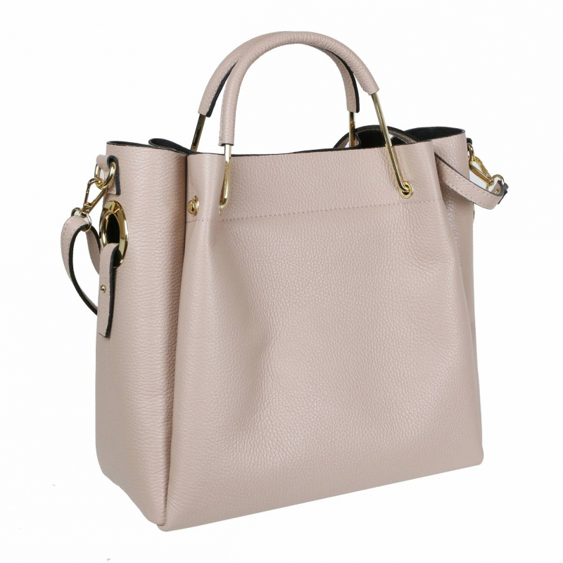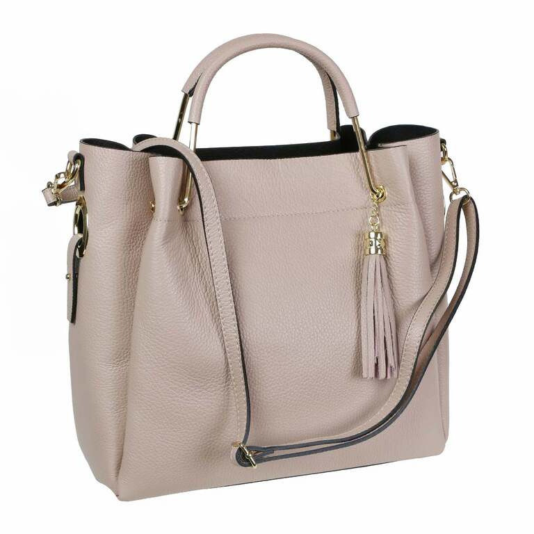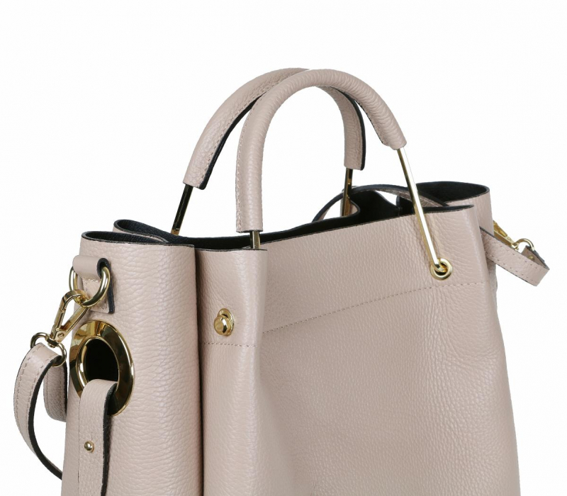 Vystužená kabelka má spevnené dno so 4 kovovými podstavcami. Úchop za štýlové otáčavé rukoväte alebo nosenie na ramene za kožený odopínateľný remienok (na kovových karabínkach). Súčasťou kabelky je odnímateľný kožený prívesok. Vnútro s hĺbkotlačou kože Made in Italy.