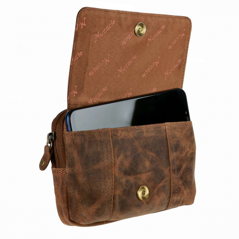 Kožená príručná taštička - puzdro na opasok MERCUCIO so závesnou karabínkou na opasok - praktická veľkosť do ruky alebo 2 spôsoby nosenia na opasku. Vyrobená z hladko brúsenej kože s mramorovanou úpravou povrchu.Taštička vhodná pre menšie predmety - karty, kľúče, mobil, peňaženka a pod. Kožené pútko na zadnej strane vyhovuje pre opasok šírky do 5,5 cm.