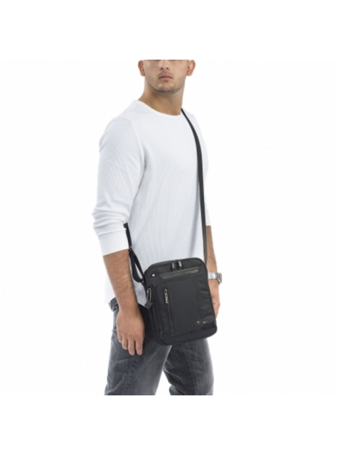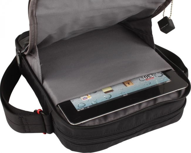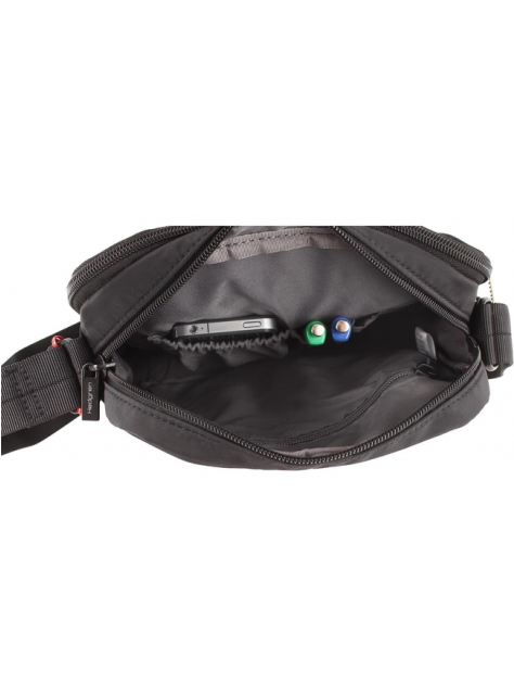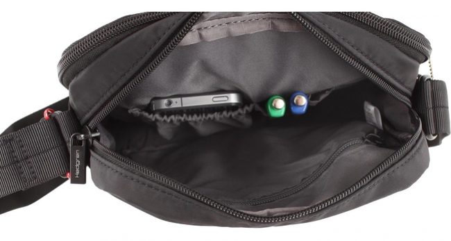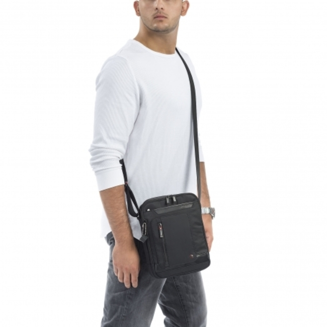 Praktická taška príručného formátu s dvoma samostatnými komorami na každodenné drobnosti, doklady, so špeciálnym vnútorným vreckom s RFID ochranou proti odčítaniu údajov z kariet. Prvá komora s polstrovaným vreckom určeným na tablet.