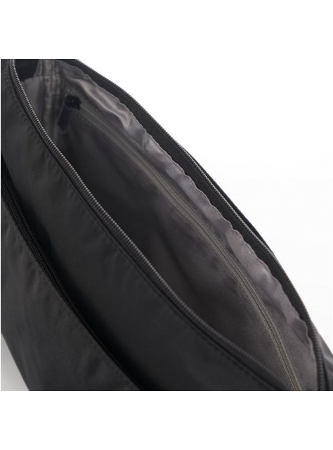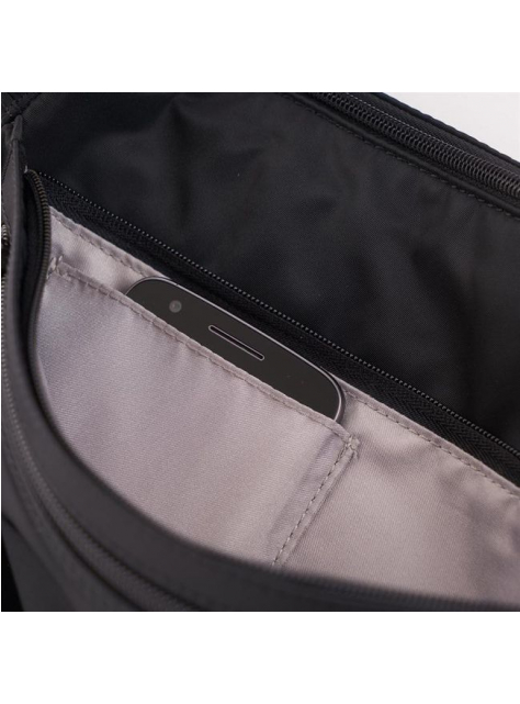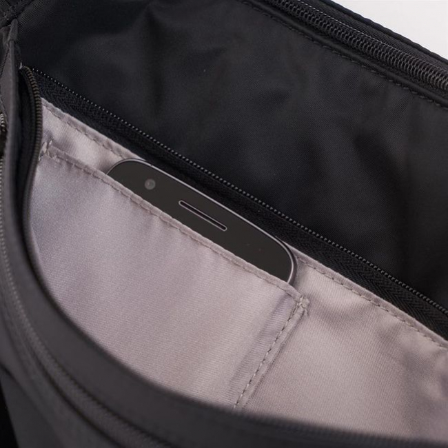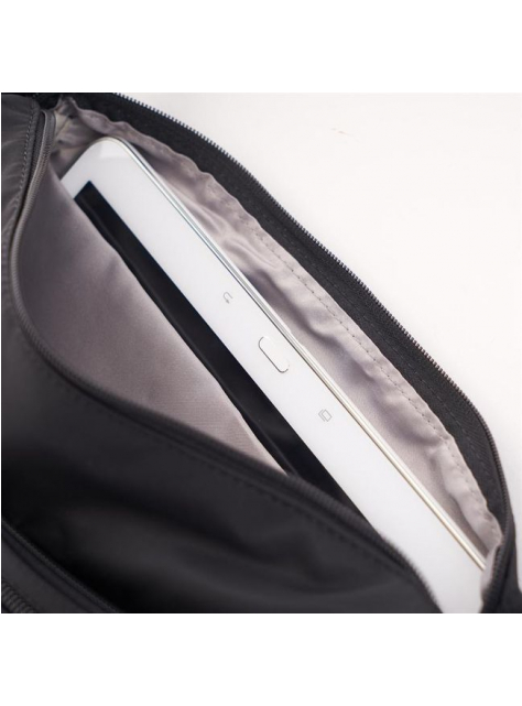 Praktická taška príručného formátu na každodenné drobnosti, doklady, so špeciálnym vnútorným vreckom s RFID ochranou proti odčítaniu údajov z kariet. Zadná stena s polstrovaným vreckom určeným na tablet.
