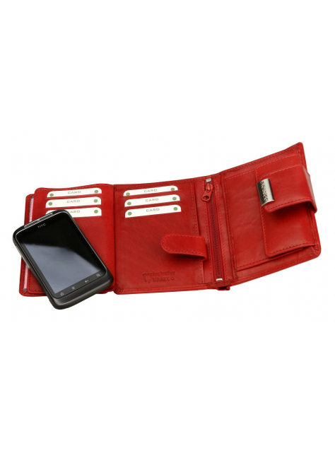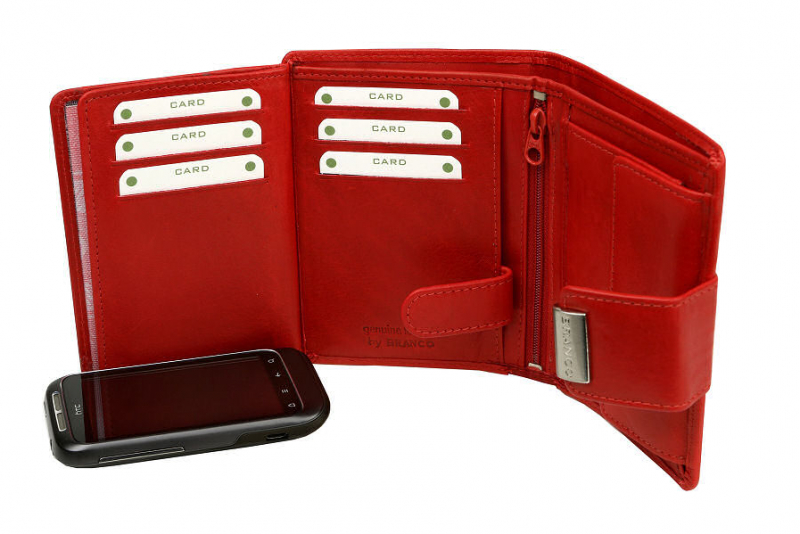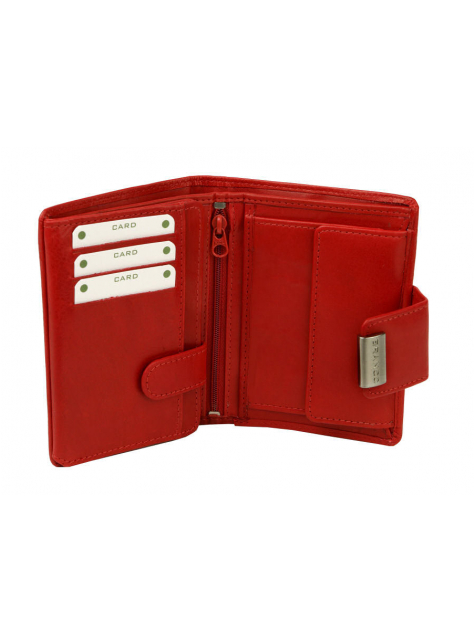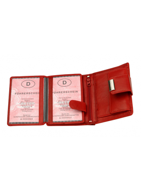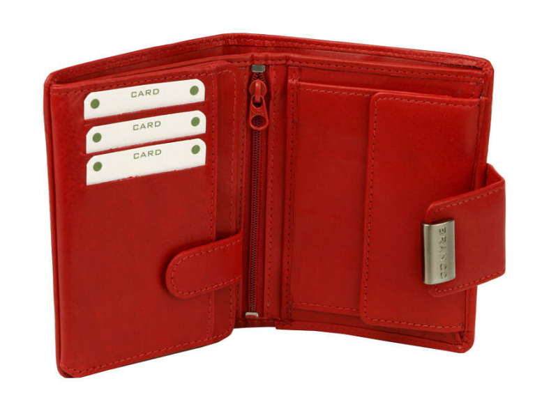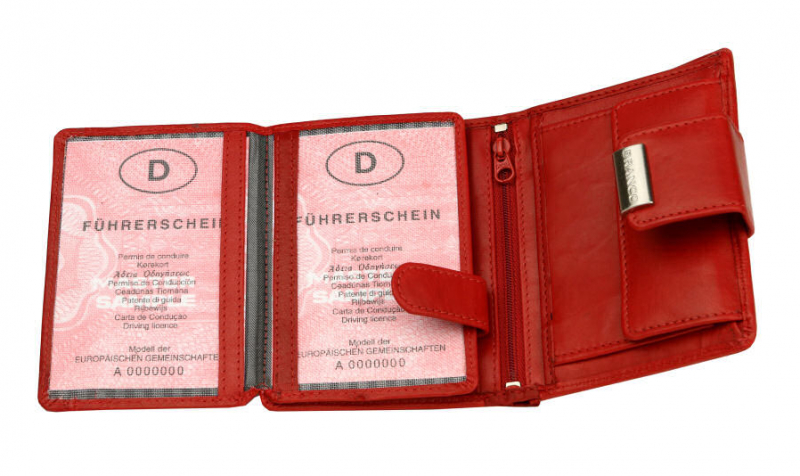 Dámska kožená peňaženka z príjemne hladkej a hebkej kože v atraktívnej rubínovo-červenej farbe. Praktický stredný formát so zapínaním na pracku, vnútorná časť tiež zopnutá prackou. Veľký obojstranný priečinok na zips s prístupom v strede (aj pre starší väčší typ dokladov).